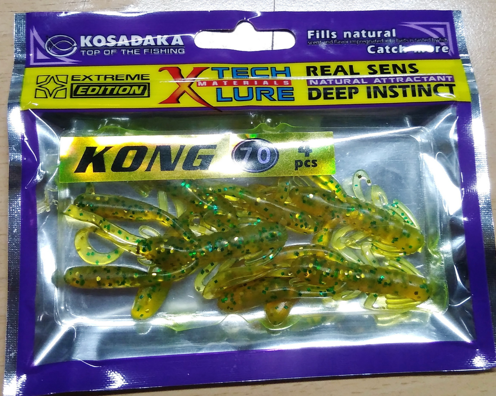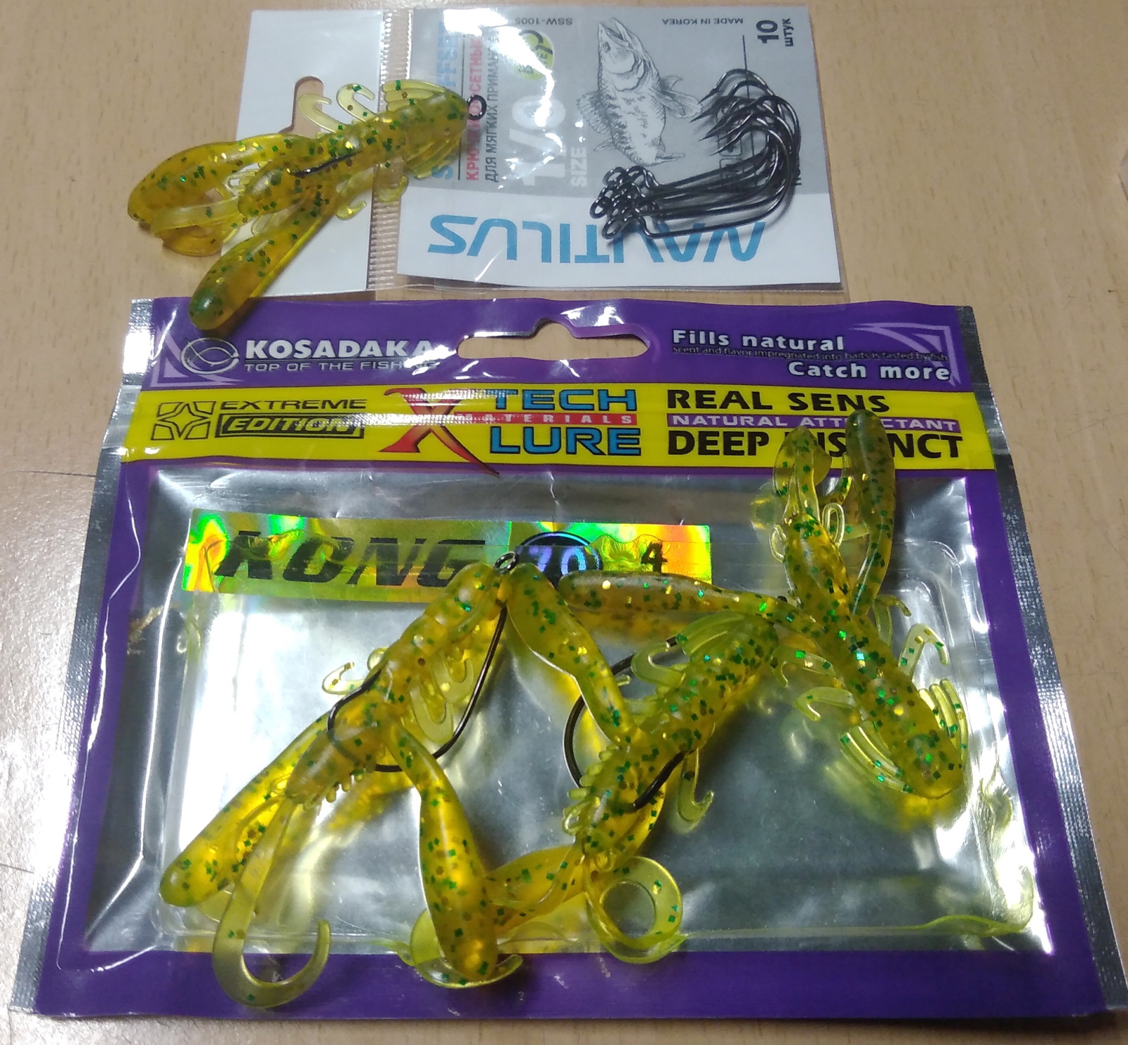 Идёт Kong в пакете с подложкой в количестве четырёх штук, негусто, но и не пусто. Упаковка яркая, с разной информацией, из которой можно выделить, то, что в приманках использован аттрактант, небольшое количество которого можно увидеть на подложке. Сам рак скользкий и имеет привлекательный для рыбы запах, я бы правда на такой не клюнул).