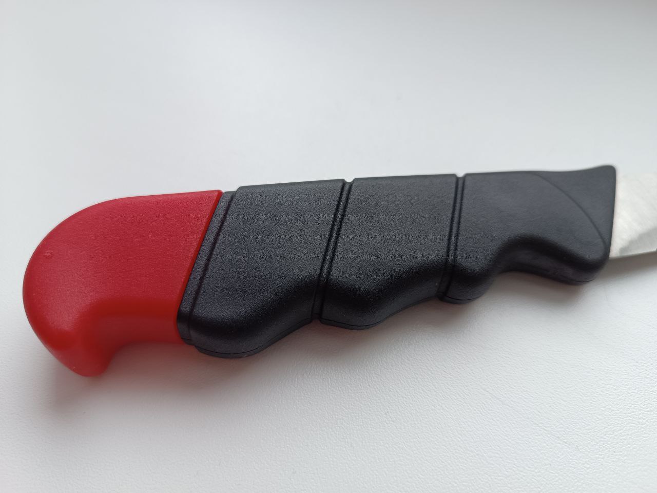 Нож выглядит солидно. Хорошая ухватистая рукоять с выемками под пальцы для уверенного хвата, чтобы он не выскочил из рук при пользовании ножом, если они у вас сырые...