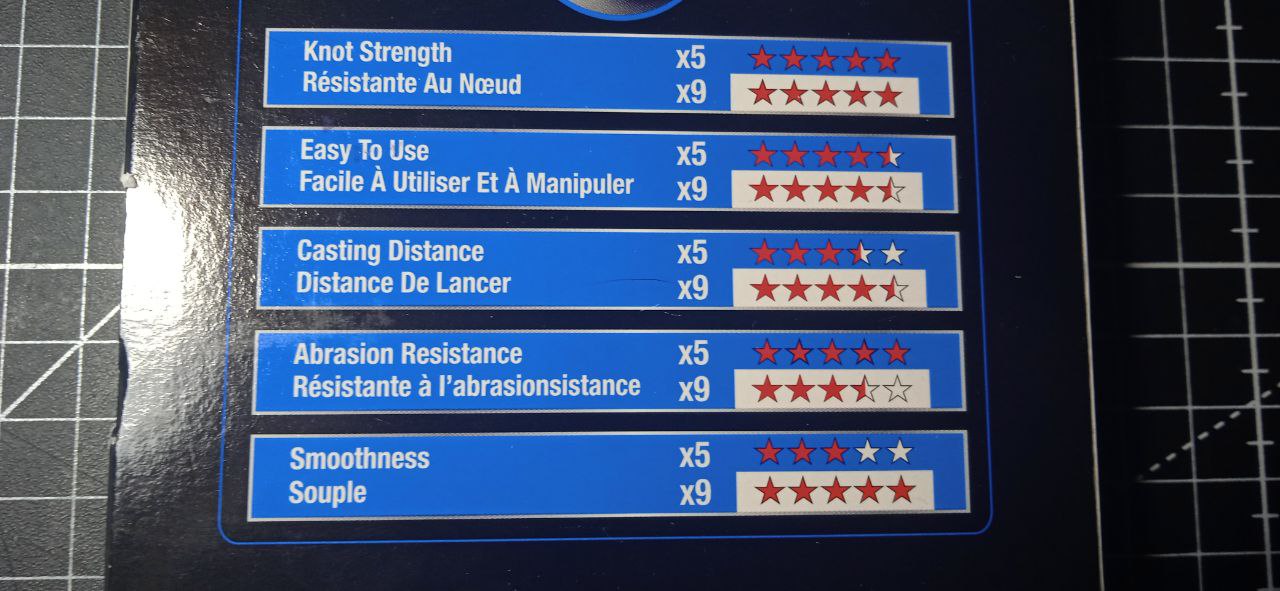 На обратной стороне коробки можно заметить интересную таблицу с оценкой параметров 9-ти и 5-ти жильных шнуров от этого бренда. Параметры оцениваются звездочками по пятибалльной шкале. Производитель оценивает прочность узла на 5 баллов, простоту использования на 4,5 балла, дальность заброса - на 4,5 балла, абразивную устойчивость на 3,5 балла и гладкость - на 5 баллов. Интересная классификация. И что приятно, не наставили себе сплошных пятёрок, как это сделали бы китайцы.