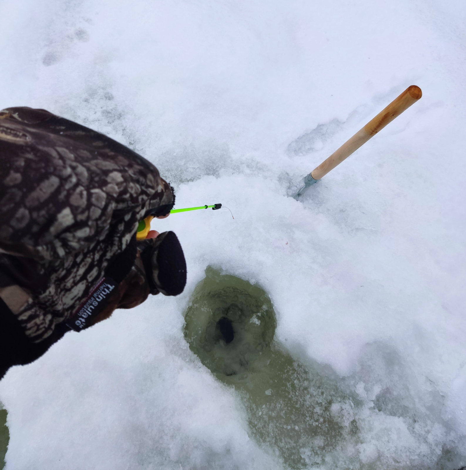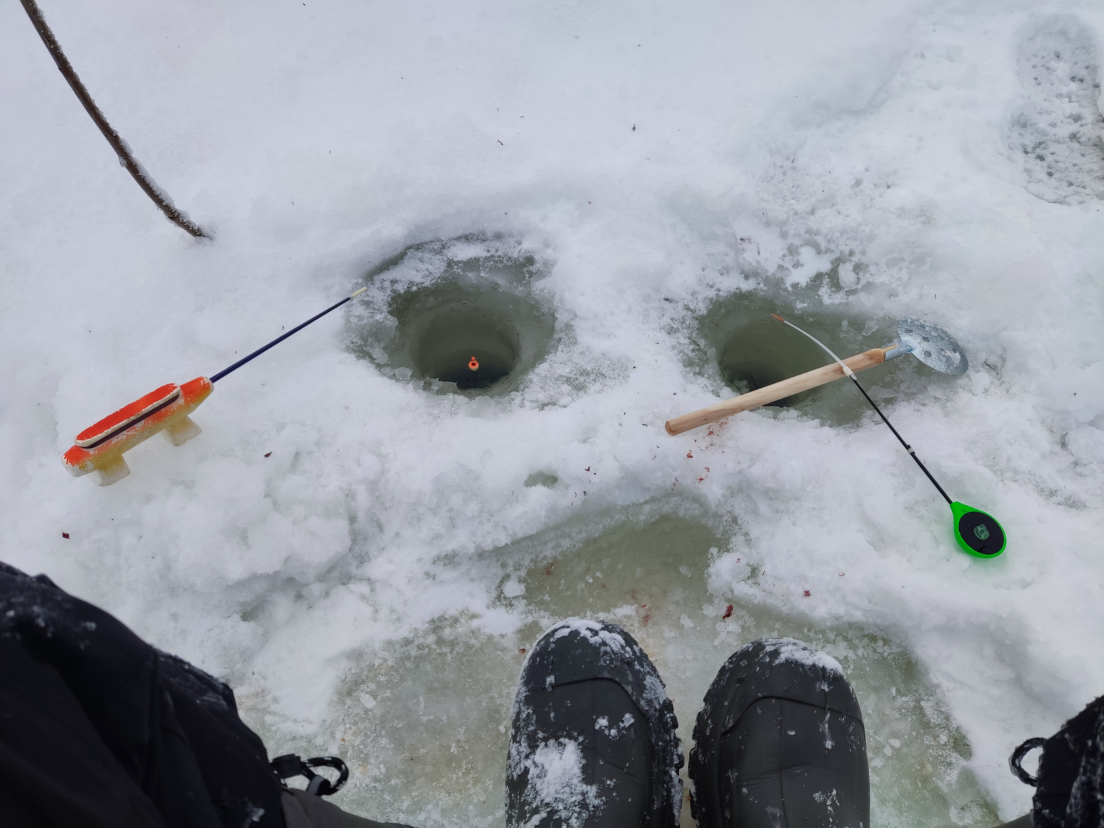 Другой существенный плюс мелкого диаметра – это вид отмычки, позволяющей залезть в чужие лунки. Спортсмены на соревнованиях вообще овальные поварешки берут, но там и буры не редко 80-90 мм встречаются. Я люблю побродить по водоему, особенно в понедельник, когда наплыв рыболовов стихает, а кормленных и перекормленных лунок огромное количество. Вот так бредешь от вешки к вешке, да гоняешь чертика по паре проводок. А если еще и погода ближе к весне и нет сильного минуса, то можно обойтись и без бура.