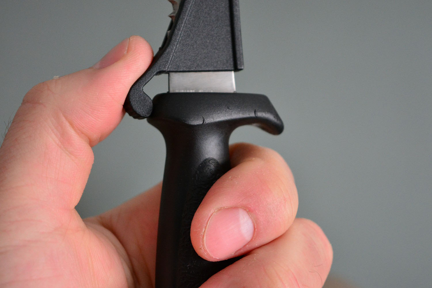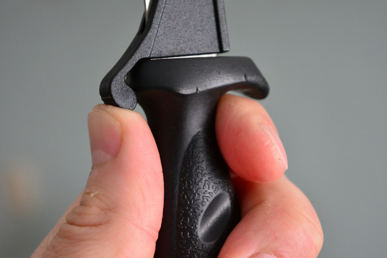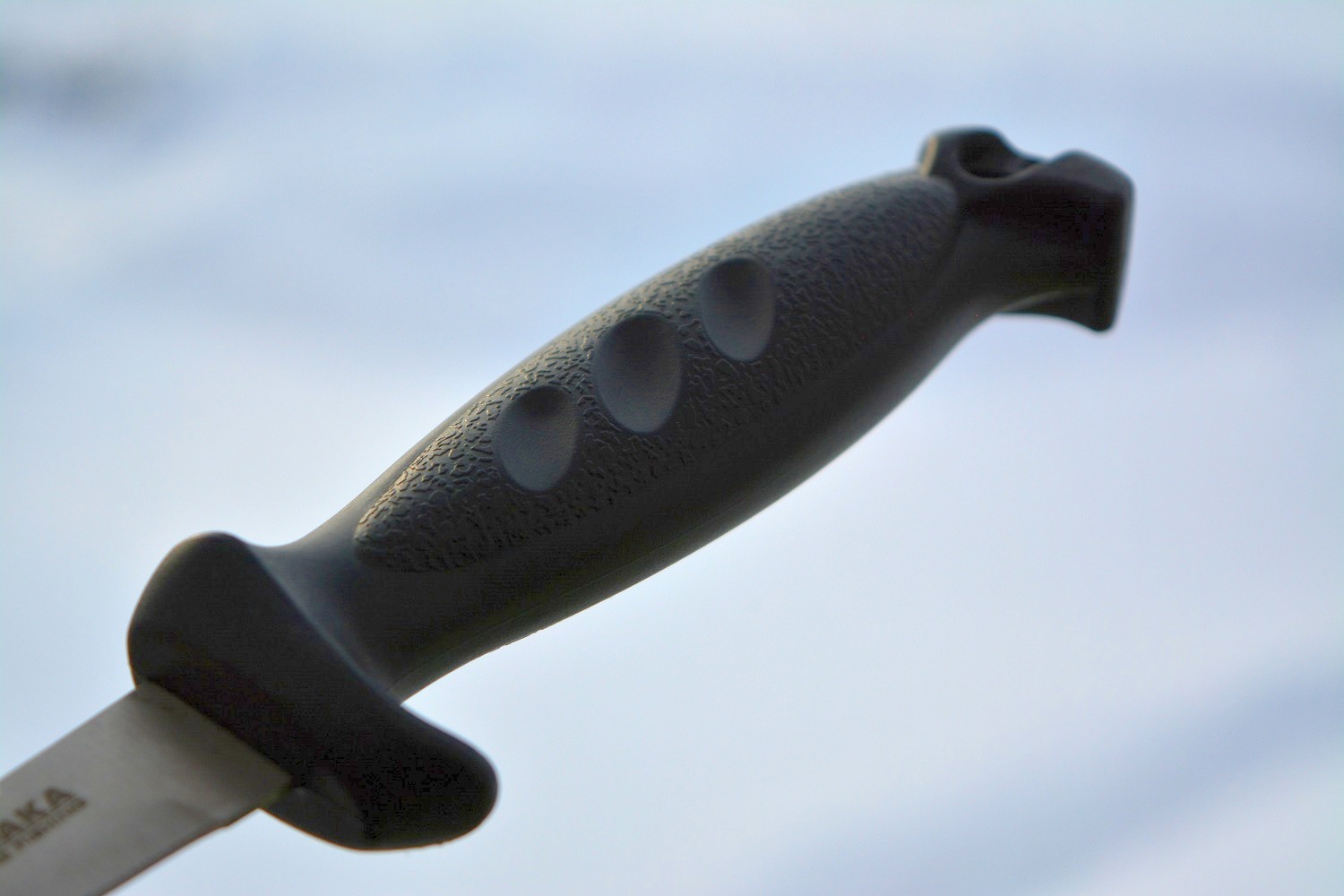 Это недорогой и долговечный материал. Но у него есть недостаток, он может быть достаточно скользким из-за, например, рыбьей слизи, попавшей на руки в процессе разделки. Однако, форма рукоятки эргономичная. По бокам пластик не гладкий. Заметная текстура создает хорошее трение. Есть также ряд выемок, которые помогают сохранить надежный хват.