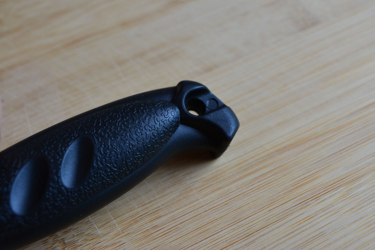 В торцевой части есть отверстие, на котором можно при желании закрепить темляк. Ну, или просто «повесить нож на гвоздь».