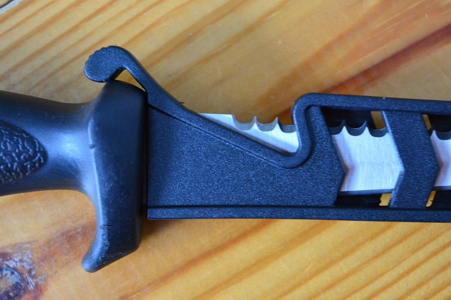 Структура ножен полуоткрытая. Они защищают и человека от пореза, и лезвие от повреждений. И при этом, дадут клинку высохнуть, если он вдруг перед закрыванием окажется влажным.