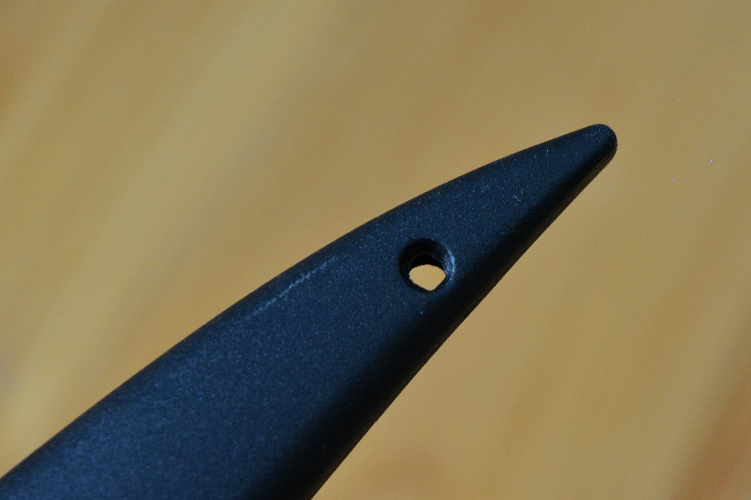 Думаю, что оно предназначено для вентиляции, потому что по-другому его не применить. Интуитивно возникает мысль продеть в него что-то наподобие темляка, но, во-первых, это не даст сделать сам нож, а, во-вторых, он переносится в вертикальном положении ручкой вверх. Для этого сбоку есть металлический фиксатор.