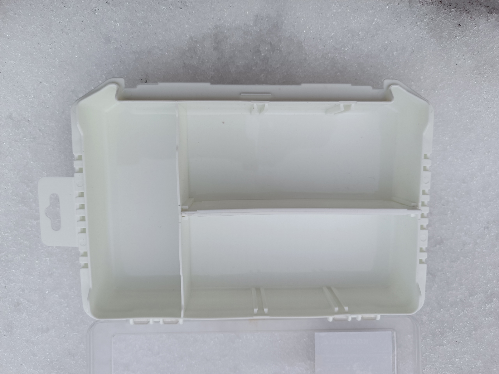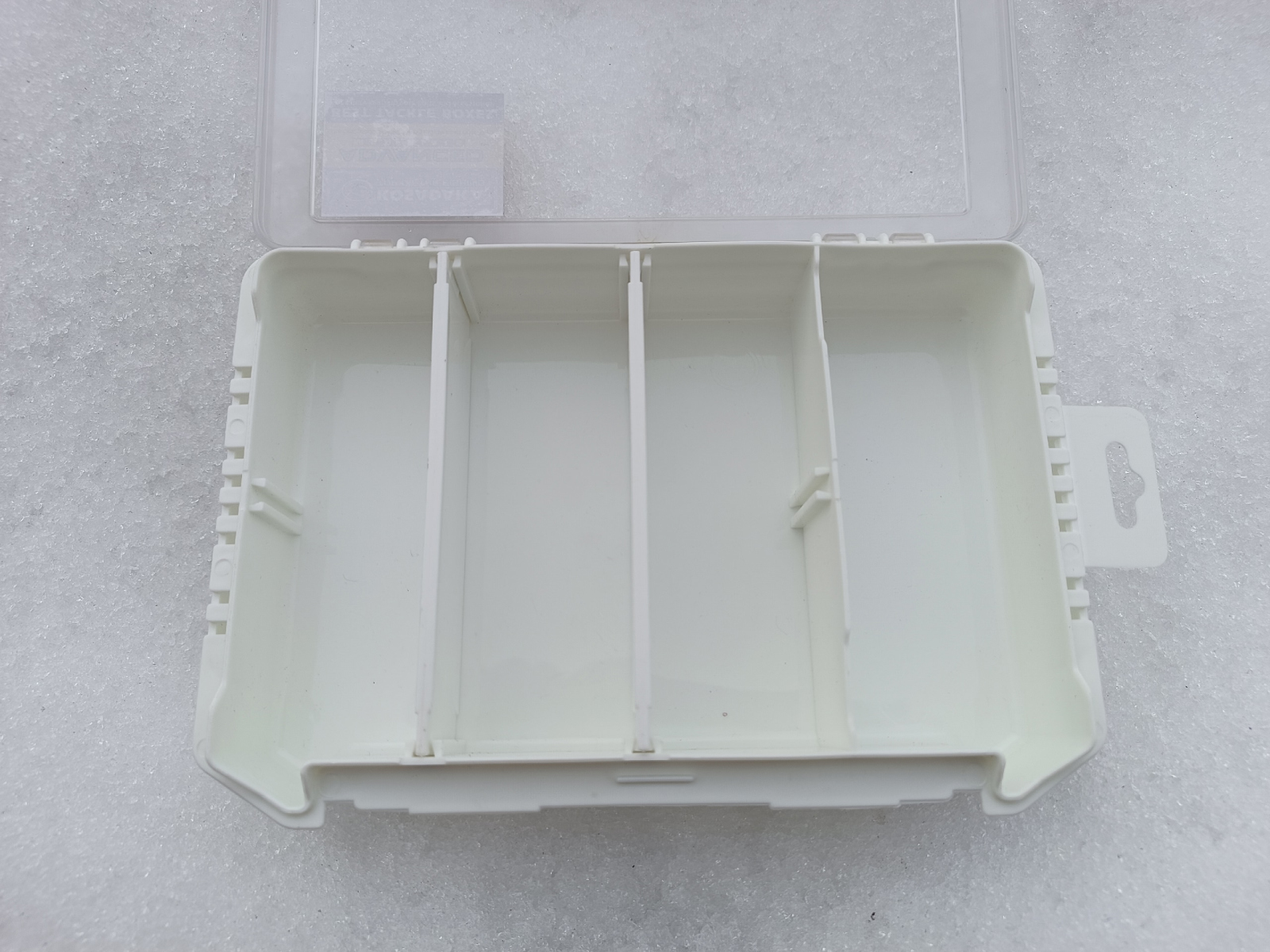 В названии коробки на сайте есть уточнение - "три секции". Так-то оно так, но немного не так. В коробке Kosadaka TB-S38-WH количество секций для хранения приманок может быть от двух до четырёх. И я в первый раз встречаю, что количество секций меняется именно вот так.
