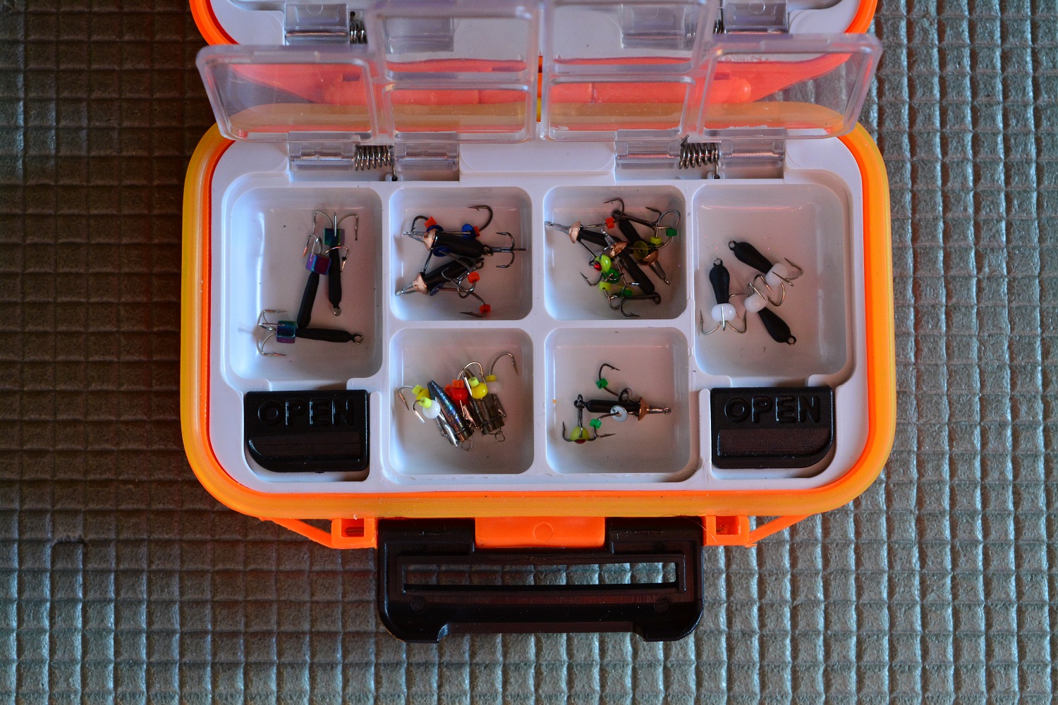 Особенно мне нравиться перевозить в такой коробочке различные «чертики» и «ведьмы», оснащенные подвижными крючками, потому что они имеют свойство постоянно наглухо цепляться за все вокруг. Здесь же они лишены такой возможности.
