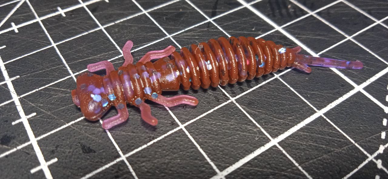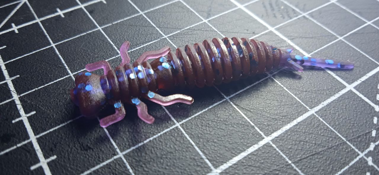 Очень порадовала структура силикона. Плотный, упругий, однородный, отпечатал даже микро шероховатости отливочной формы. Качество литья отличное. Многие именитые бренды косячат при производстве продукции с кратно более высокой ценой. Здесь же ни облоя, ни пузырей, ни каких либо замутнений. Пропорция и размер блесток подобраны с умом. Очень порадовала расцветка хамелеон под аббревиатурой RB. При прямом попадании солнечных лучей цвет становится буро - малиновым.