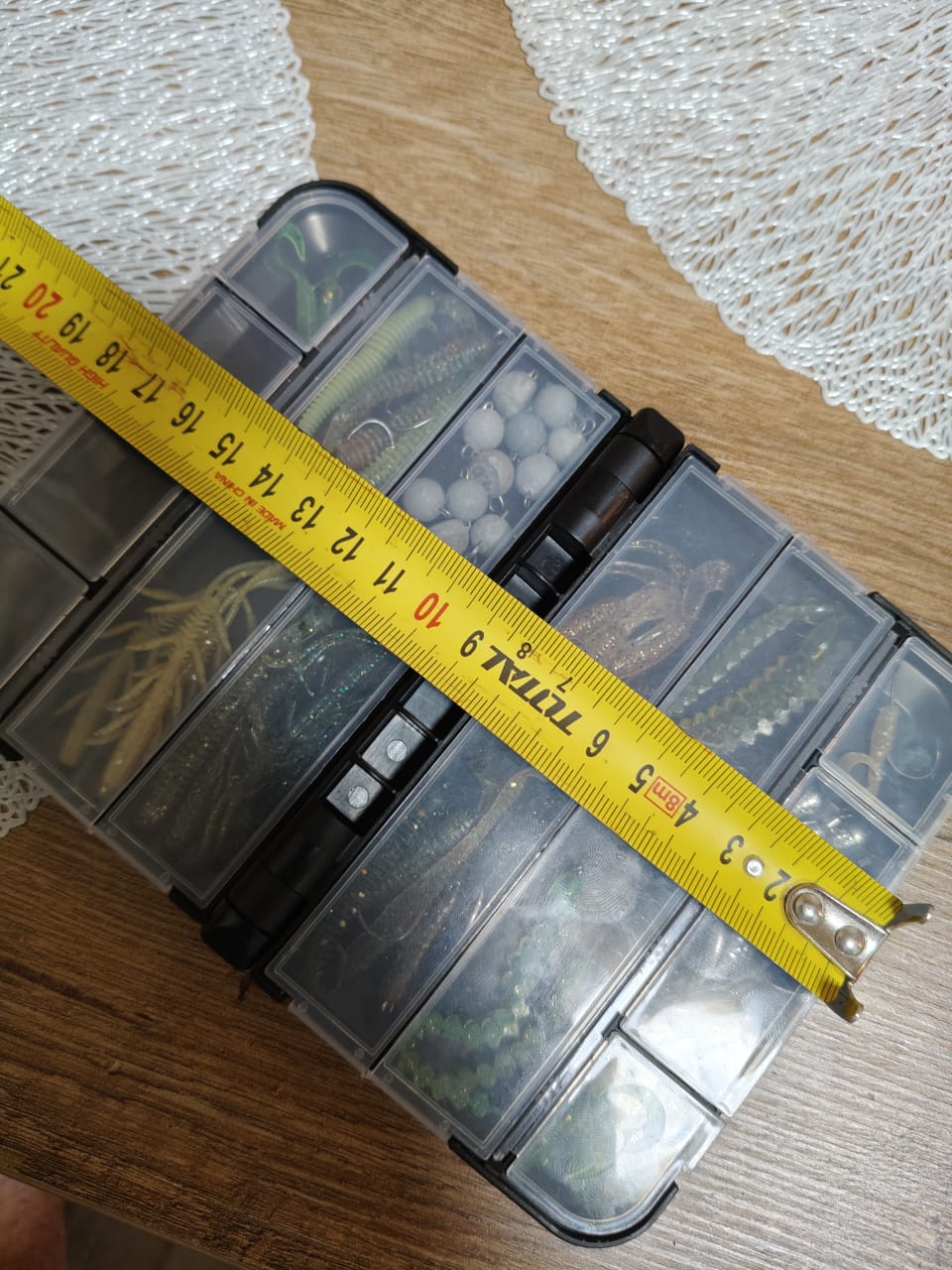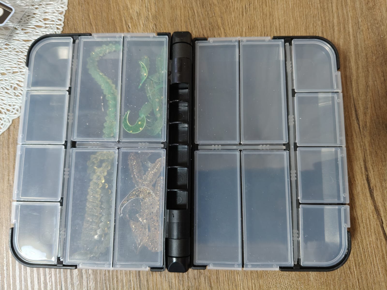 В отсеках побольше комфортно размещаются приманки величиной 2 дюйма (ну плюс/минус), причем даже оснащенные крючком и грузиком приманки себя довольно комфортно чувствуют. Да, иногда приходится подгибать и подворачивать приманки, но если силикон мягкий или вы постоянно и часто их используете, то такой «подворот» не страшен. Также я с успехом разместил в таком же отсеке незначительный набор самых ходовых грузиков – от 2 до 4 граммов. А вот с отсеками поменьше история не такая простая, как может показаться на первый взгляд. Из-за фаски на крае коробки внутреннее пространство данных отсеков несколько пострадало. Зато там прекрасно уживаются микротвистера, всякого рода микро-микро приманки, грузики в небольшом количестве. Но это исключительно моя компоновка, никто не запрещает вам разместить там крючки, застежки, или другую всячину (но для этого у меня есть другая коробушка).