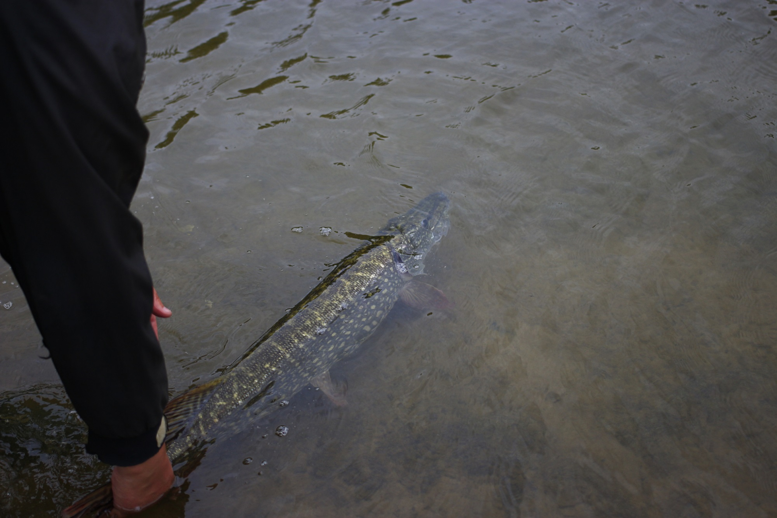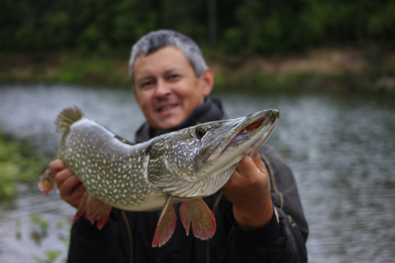 Одинокая коряга на четырёх метрах, сильное течение и вроде рыбе тут делать сейчас нечего, но манит её сюда как магнитом. На первой же проводке, стоило только поравняться виброхвосту с корягой, приманку атакует рыба. Кто часто ловит равномеркой знает как это — ощущение, будто кто-то подбросил приманку. Не подсекаю, подаю спиннинг от себя, чтобы FAT начал медленно тонуть, покачиваясь на течении, и тут же щука съедает предложенную добычу. Резкая подсечка и весёлое вываживание против струи. 7040 грамм. Спасибо река, спасибо Kosadaka FAT!