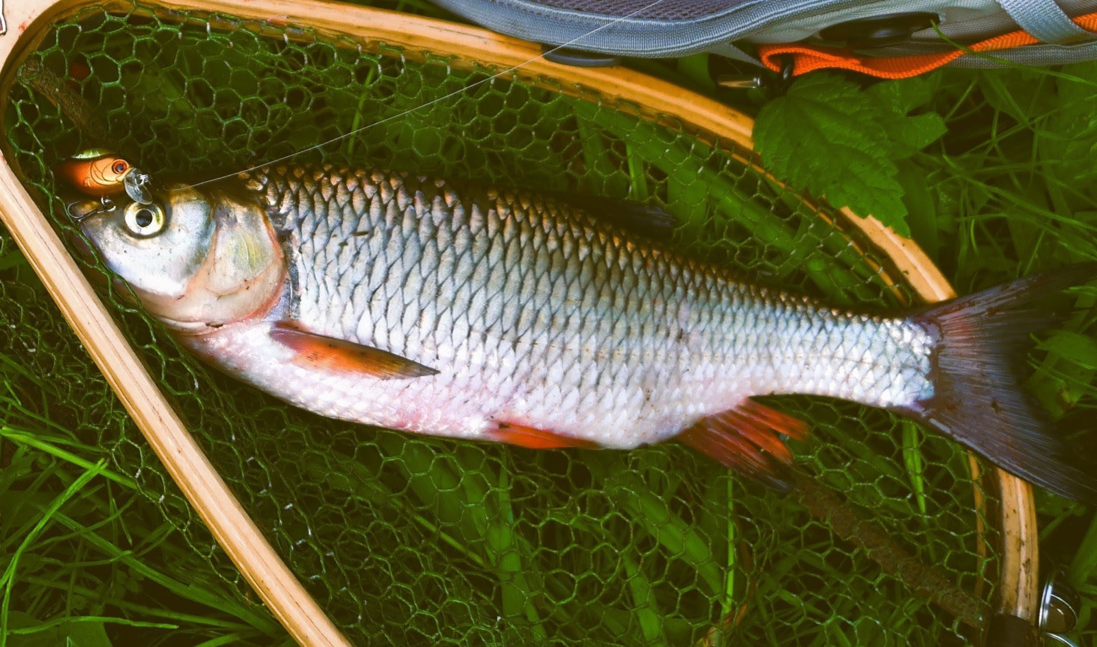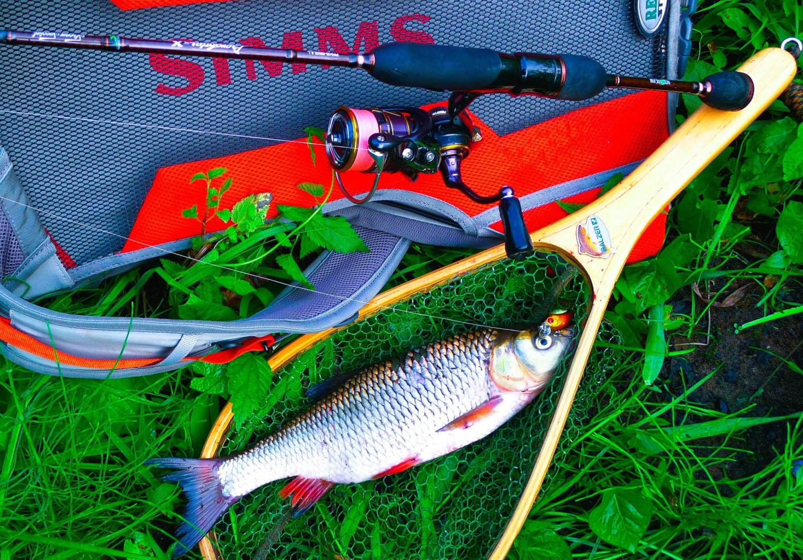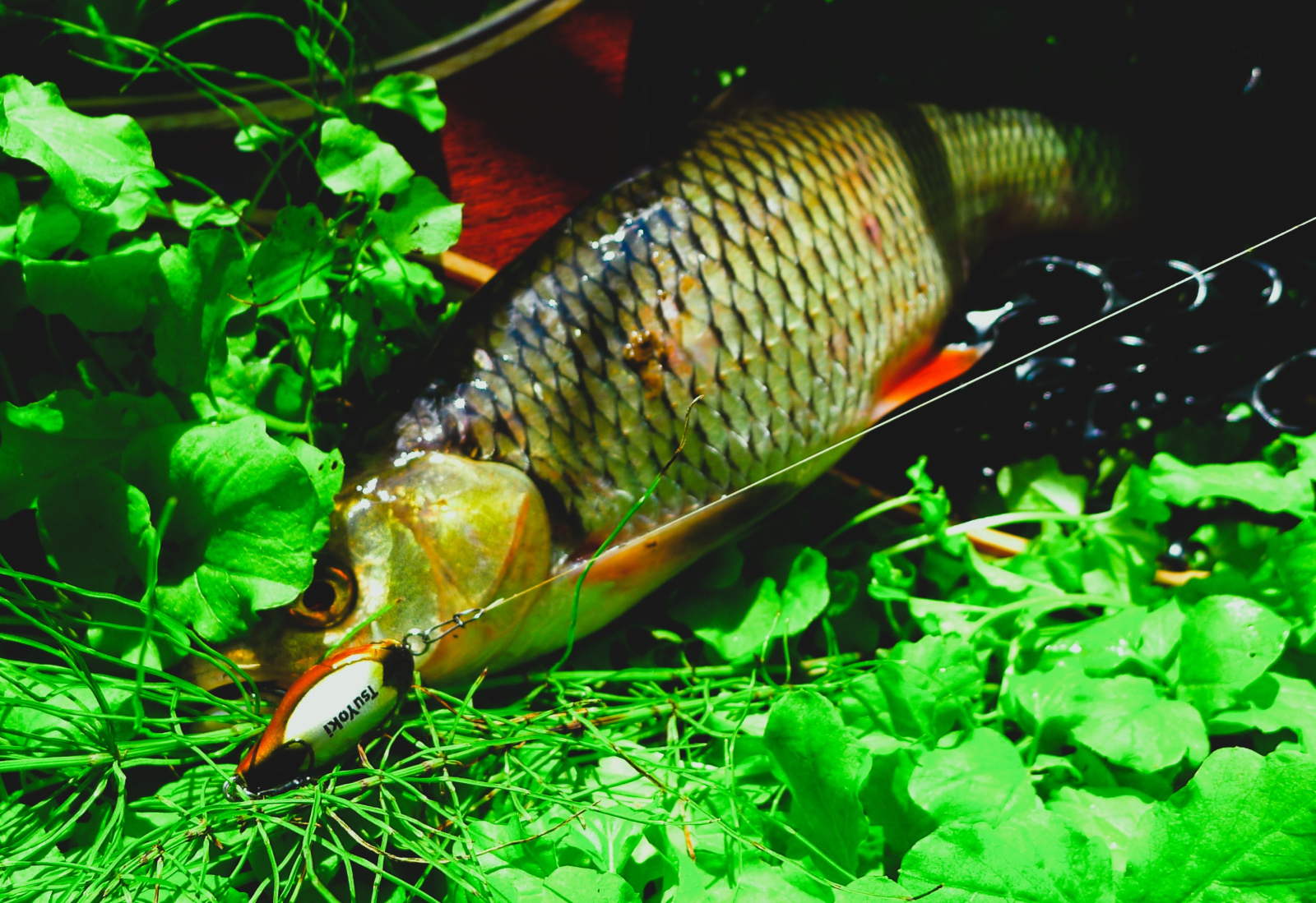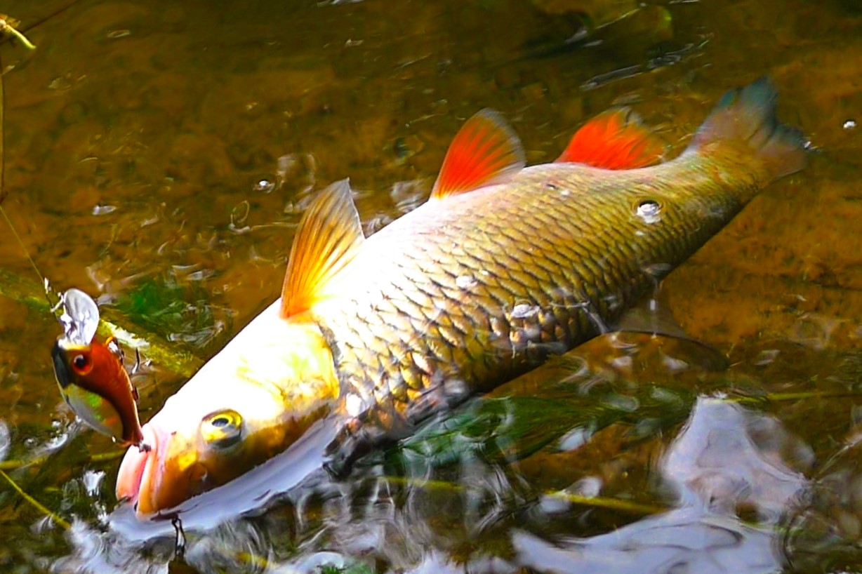 Течение TsuYoki Chef 32F держит хорошо, поэтому пригоден для ловли на любых голавлевых реках, с любыми перекатами. По классике им хорошо можно облавливать такие места ниже перекатных зон, запуская воблерок по дуге и периодически задерживая проводку в перспективных точках, за виднеющимися сквозь линзы поляриков камнями, корягами и в окнах средь травы. Крючки -тройнички на воблере острые и крепкие, так что на выводе против струи еще ни разу не разгибались, даже если приходилось форсировать вываживание, не давая голавлю нырнуть под корягу, или обрезать шнур об встречный камень.