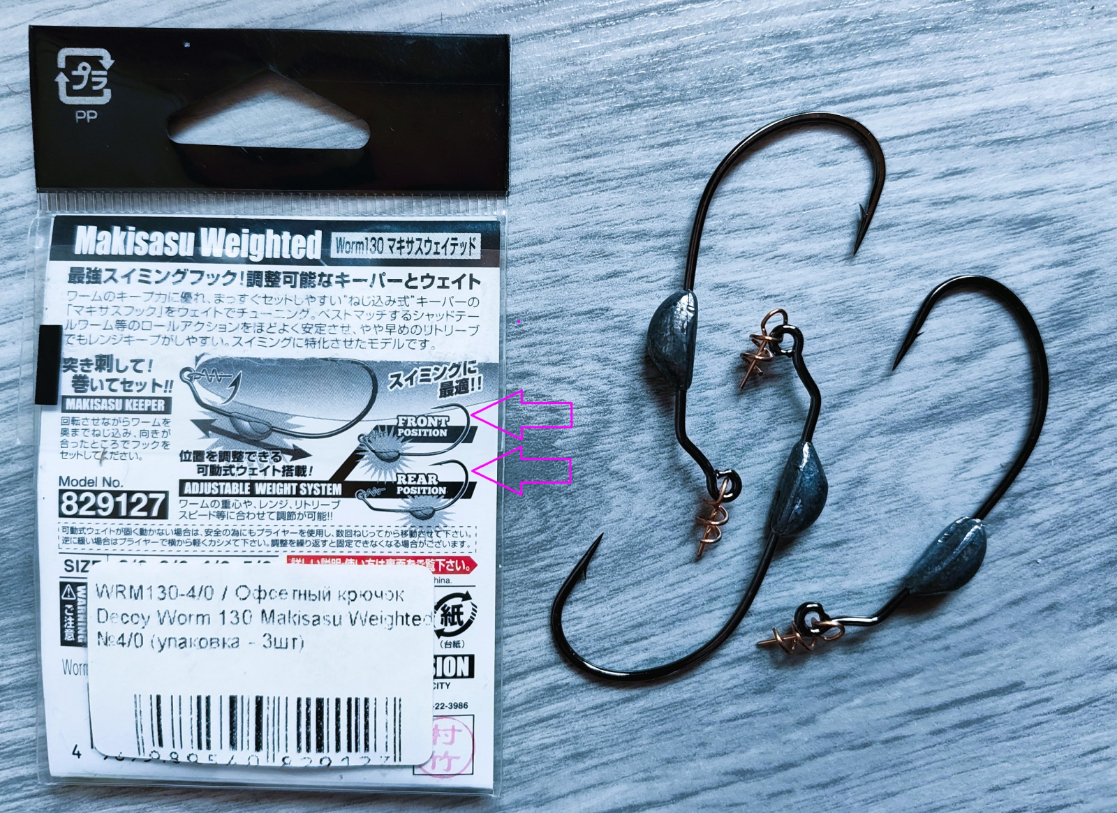 Традиционно для Decoy, на обратной стороне вкладыша упаковки, в которой поставляются данные крючки, имеется картинка, показывающая правильную оснастку приманок при помощи Worm 130 Makisasu Weighted. Кроме того из рисунка следует, что груз можно сдвинуть вдоль цевья крючка, при необходимости изменения центра тяжести, формируемой вами оснастки. Это очень удобно и расширяет возможности при подборе наиболее интересных, на ваш взгляд, видов оснастки, позволяющих приманкам погружаться в воду, располагаясь как с наклоном на головную часть, так и с горизонтальной ориентацией в воде, во время остановки проводки.