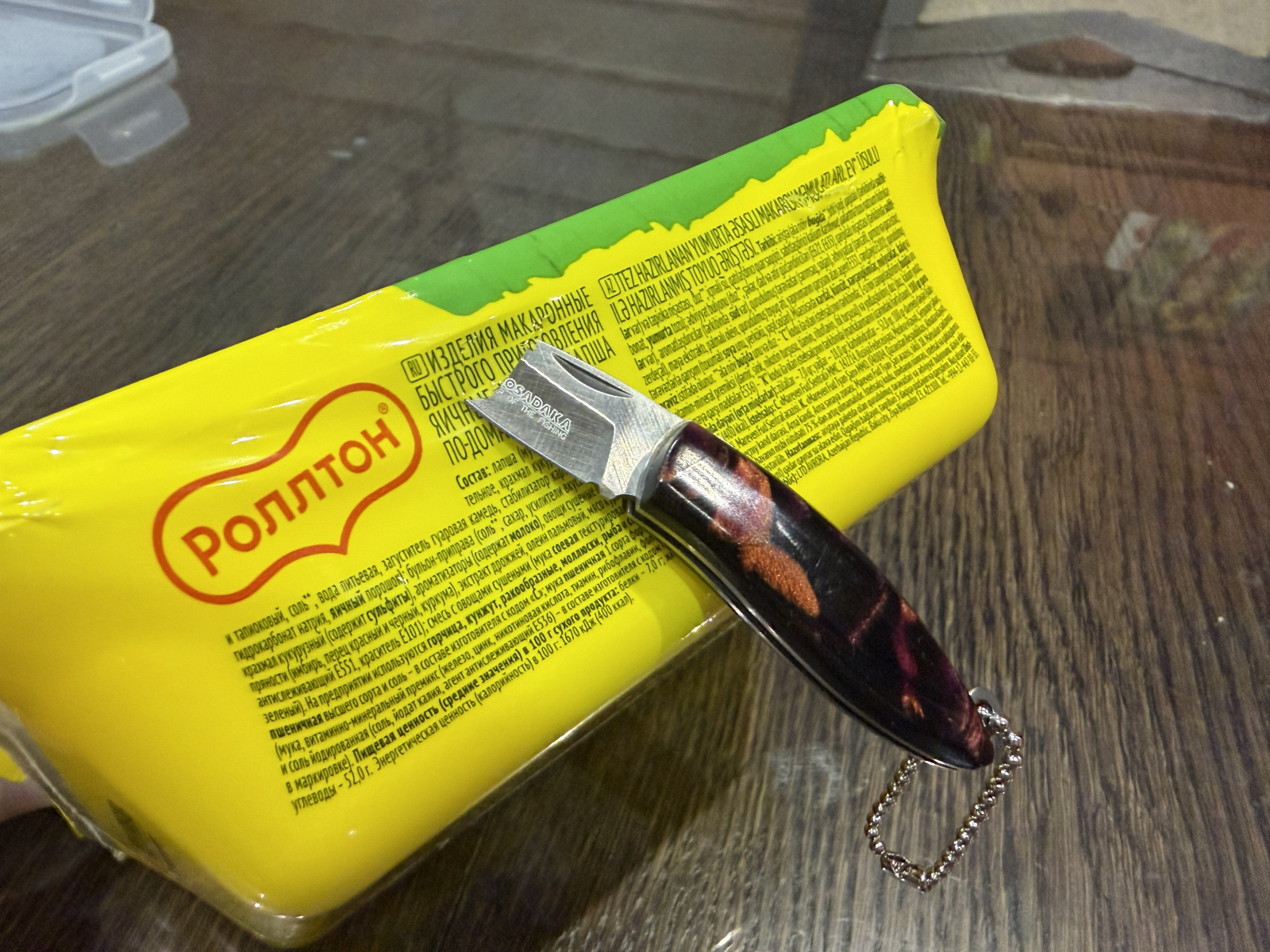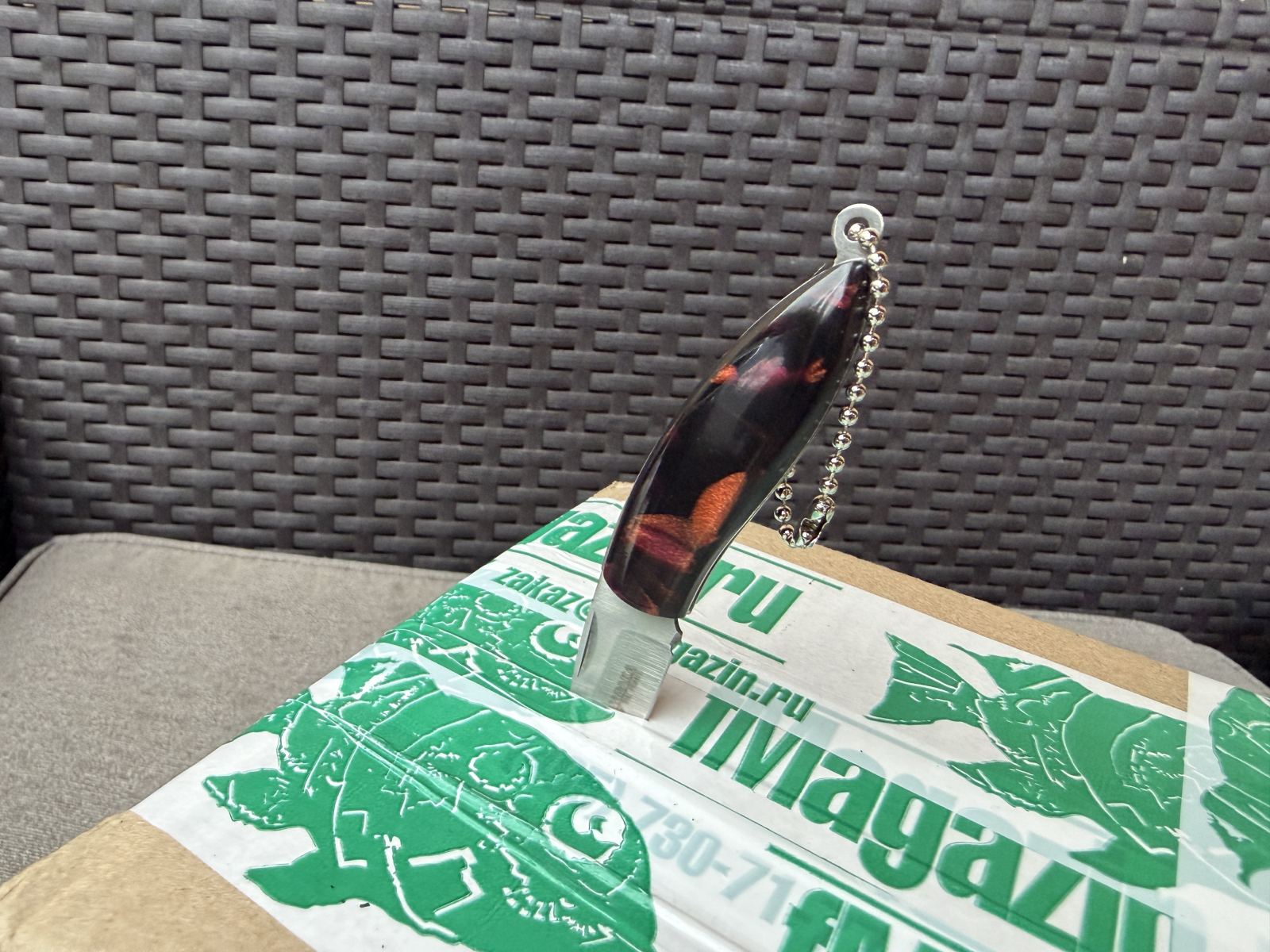 В комплекте идет знакомая с детства цепочка, которой нож можно к чему-нибудь прикрепить, например к карабину, шлевкам ремня, техническим отверстиям брюк, куртки или сумки. При желании, цепочку можно заменить на заводное кольцо.