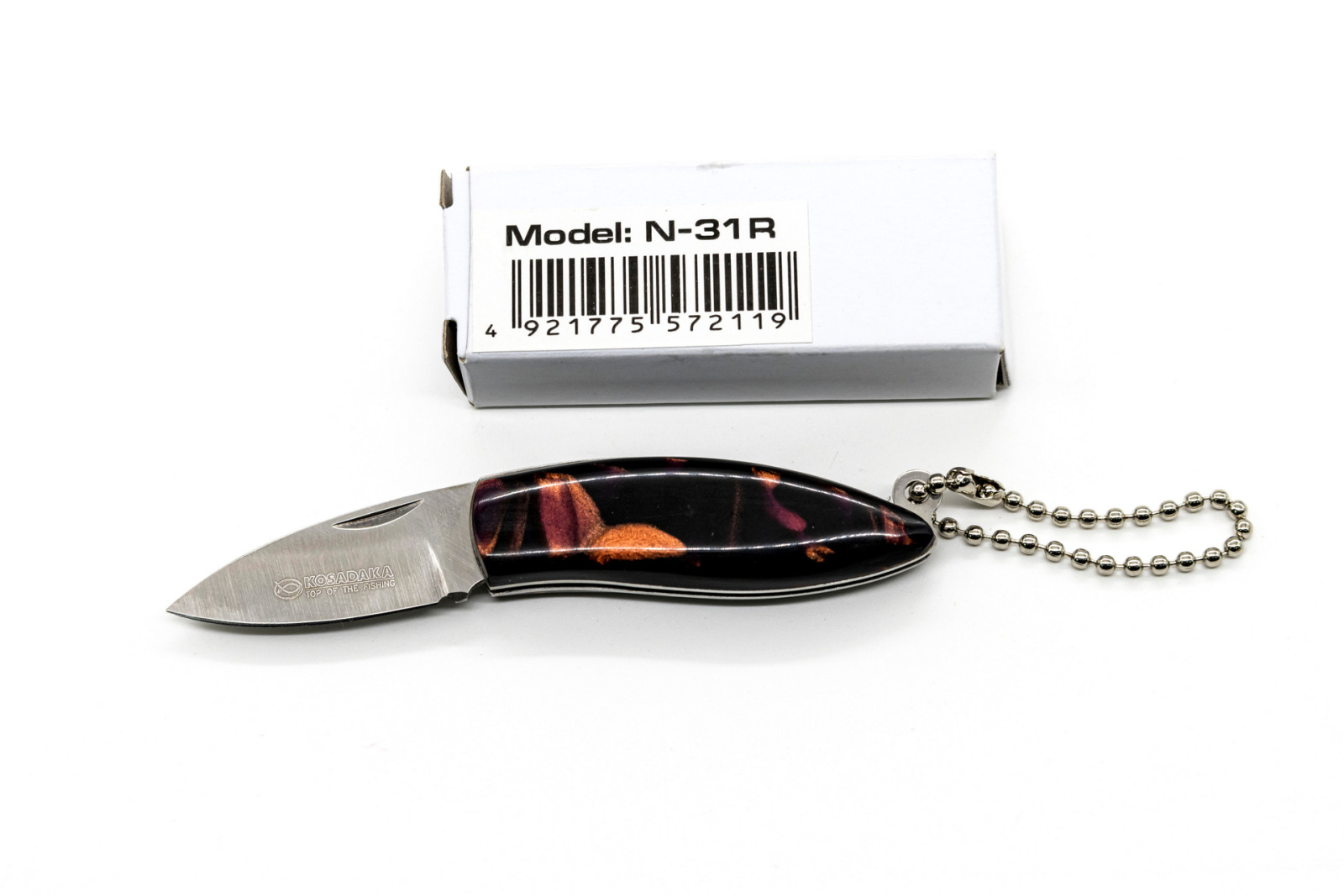 Складной карманный нож Kosadaka N-F31R упакован в миниатюрную картонную коробочку.