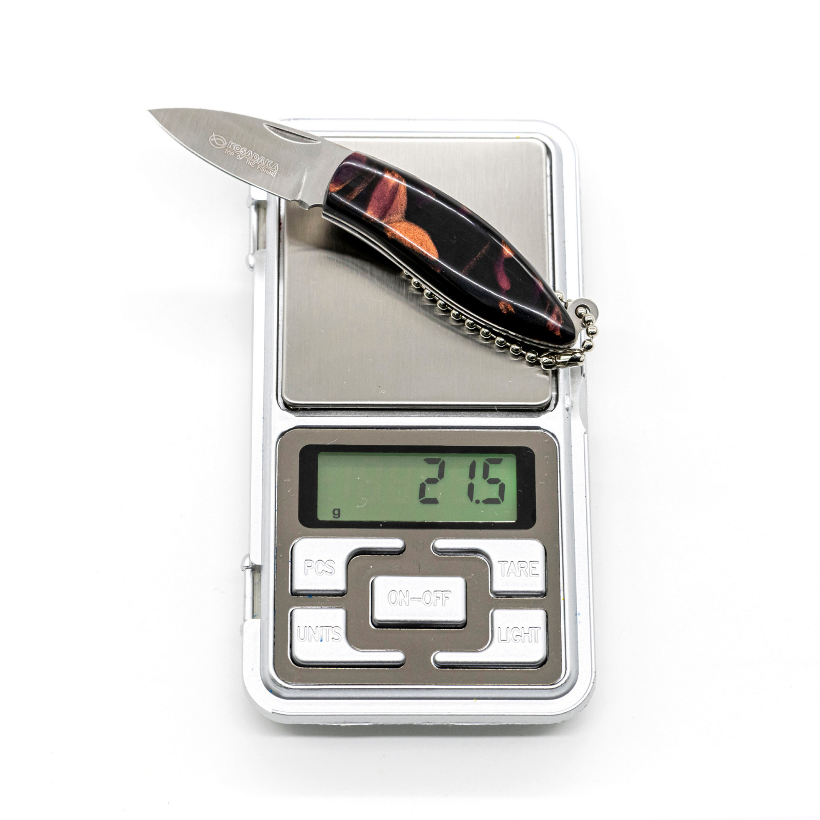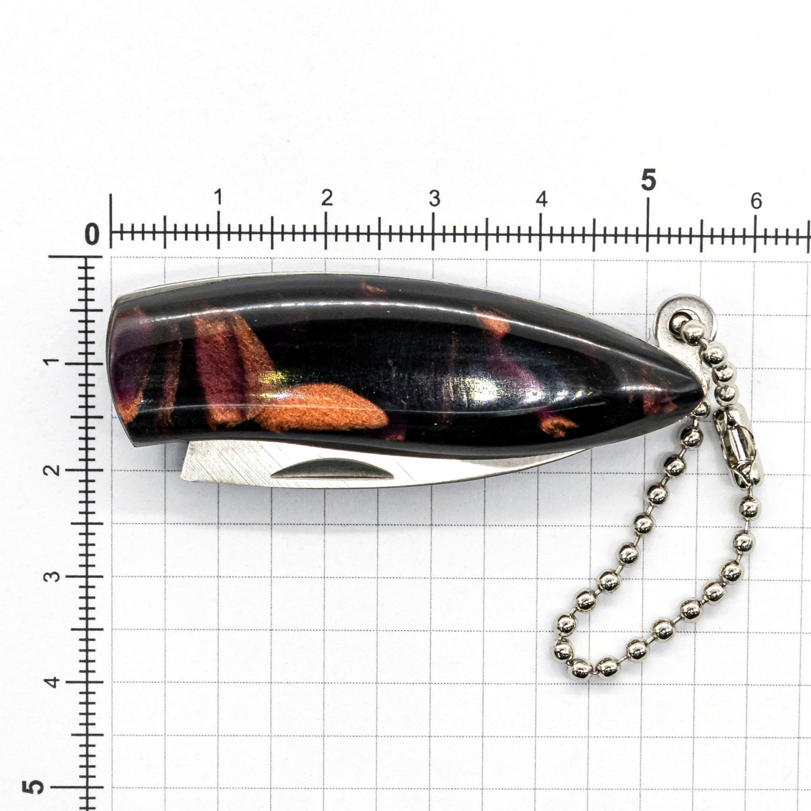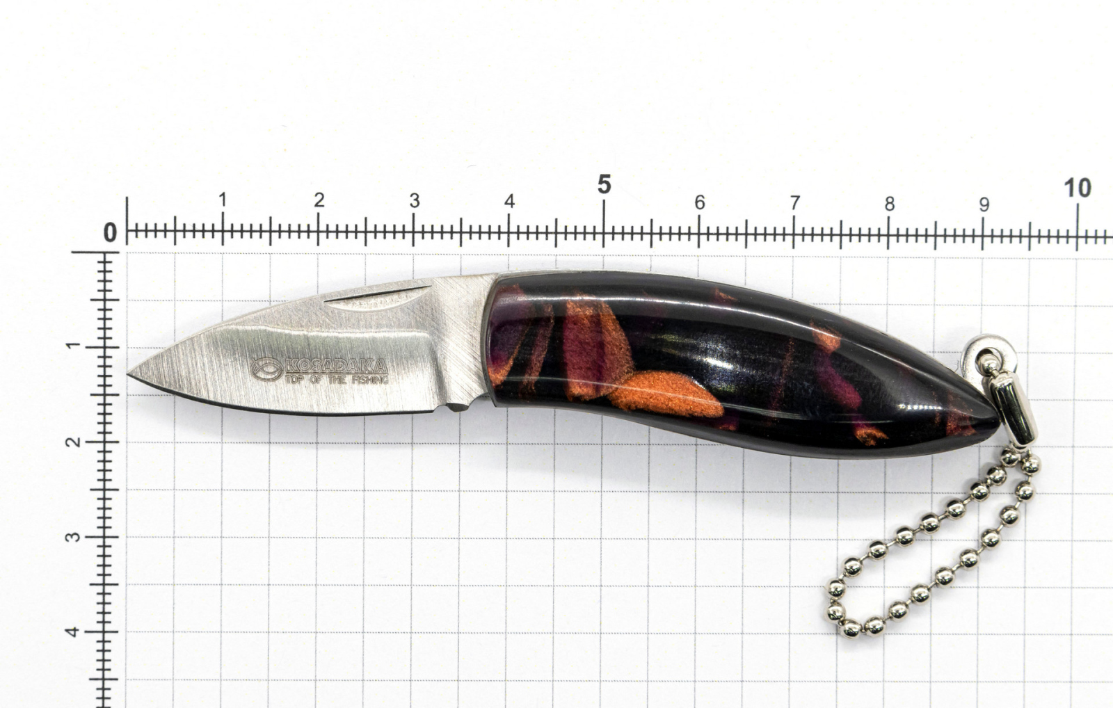 А в разложенном виде нож чуть больше 9 см не считая цепочки.