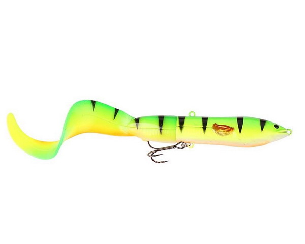 С другой его пластиковый корпус, имея вытянутую сигарообразную форму больше походит на какой-нибудь уокер. На хвостовой части, которого на металлическом штырьке (по форме сильно напоминающим стрелку на дорожном знаке) мы видим, пожалуй, главную фишку этой приманки – силиконовый твистерный хвостик. Который в свою очередь сделан из плотного, я бы даже сказал жёсткого силикона. И он светится в темноте ярким ядовито-зелёным светом.