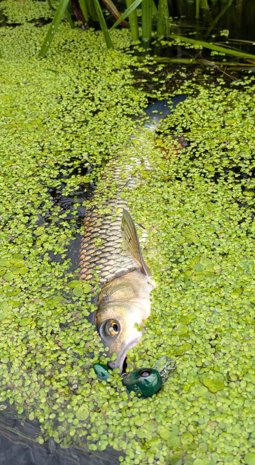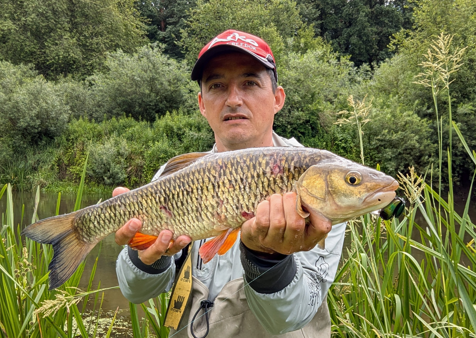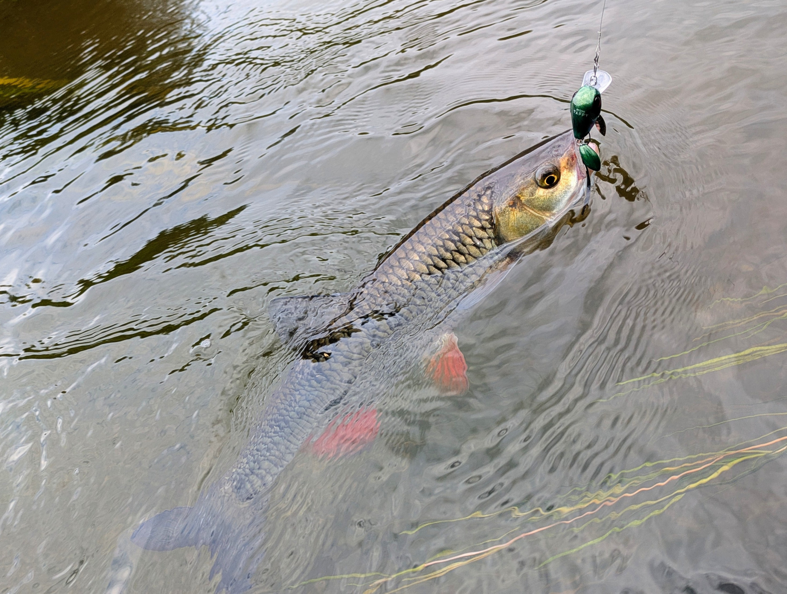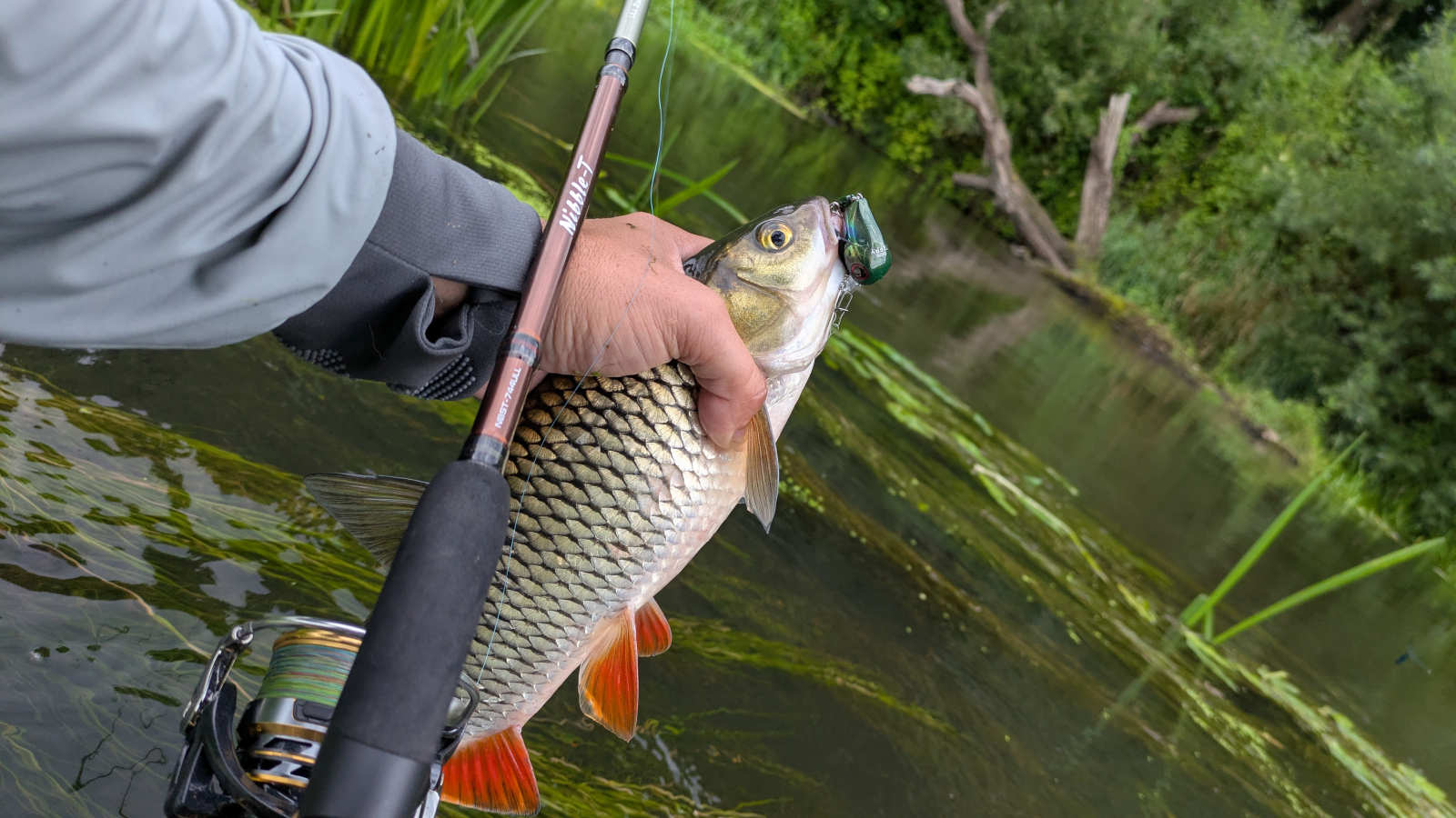 Я стаял в воде в вейдерсах, приманка была уже недалеко, метров в 15 от меня, проводка приманки шла по поверхности воды и тут голавль её съедает с громким «чавком». Такая поклевка у меня была впервые в жизни, и я был очень впечатлен.