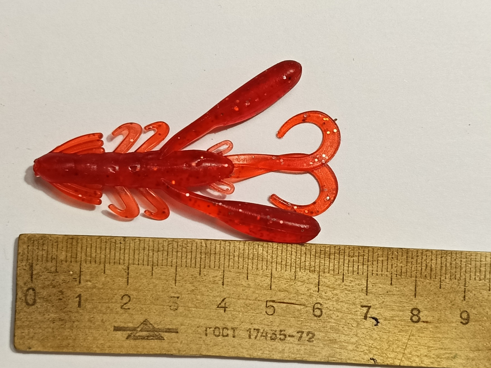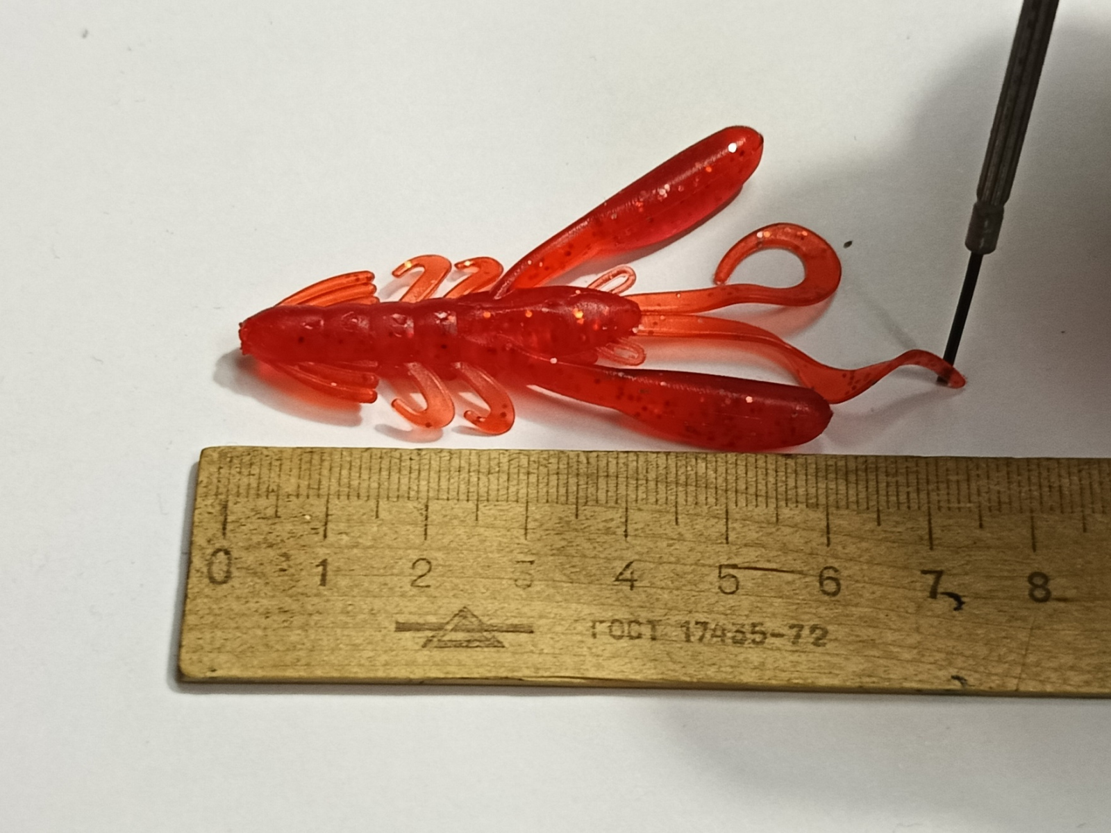Как можно судить по надписям на упаковке, то длина приманки составляет 70 миллиметров. Но положив приманку на линейку видим, что твистерные усики едва переваливают за отметку 65 миллиметров. А стоит придать усикам вытянутое положение, то можно смело сказать, что Kong имеет 75 миллиметров, а то и больше. На данный момент, это единственный размер в котором компания Kosadaka выпускает данного рачка, а ведь интересно было бы посмотреть на более мелкие размеры в 50 или 40 размере при ловле полосатых разбойников на микоджиг.