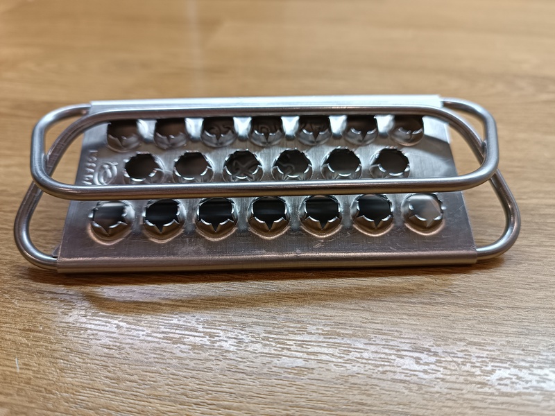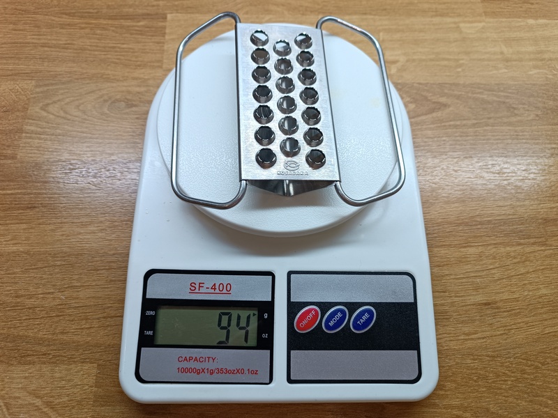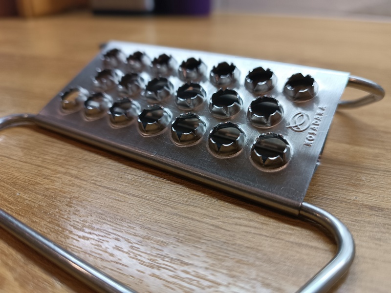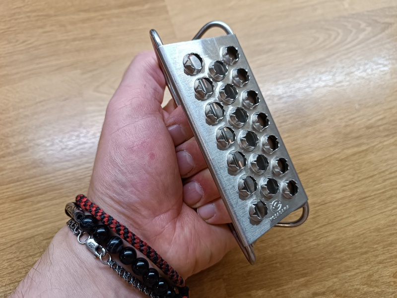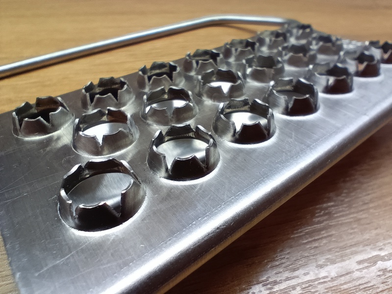 Принцип работы как у терки. Имеется 20 (специально посчитал) отверстий, сделанные острыми краями наружу. Именно они цепляют чешую и отделяют ее от туши. Края действительно достаточно острые, так что рекомендую быть осторожными и не давать играть детям или людям с нарушенной координацией.