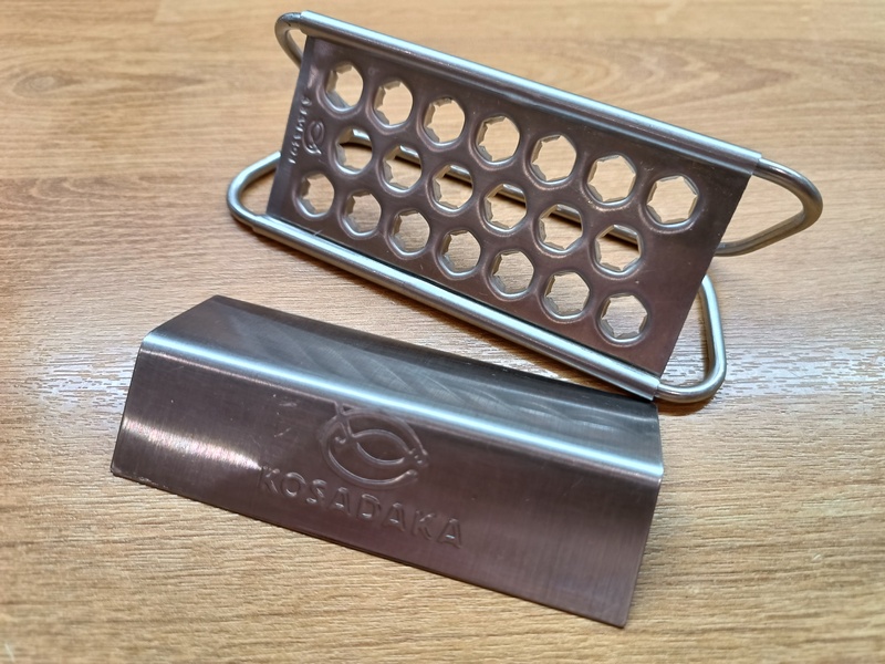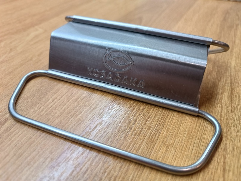 Такое решение напомнило самопальные рыбочистки, которые обычно «колхозят» в походных условиях, прибивая к доске металлические крышки от бутылок. Только тут все аккуратно, стильно, брендировано (с чеканкой в виде фирменного логотипа и надписью Косадака). Защитный кожух. Как понимаю, он предназначен дабы отделяемая чешуя разлеталась не столь сильно во время процесса и потом вы не мучались часами, собирая под пристальным взглядом жены каждую чешуйку, которая разлетается на несколько метров от кухонного стола.