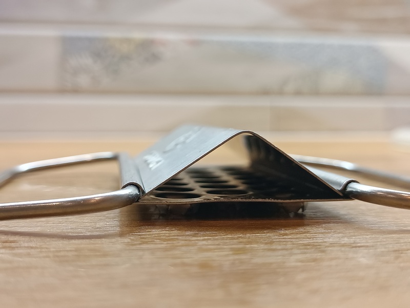 Кстати, лайфхак – чистите в раковине, под несильной струей воды, так зона поражения будет сокращена до минимума. И да, кожух реально работает. В конце процесса, снимая его для промывки инструмента, внутри обнаруживаешь кучу рыбьей шелухи. Ну и ручки. Это два изогнутых металлических прутика, имеющих подвижность чуть ли не на 360 градусов. Хват уверенный, держать удобно, из рук не выскальзывает. И еще один практический совет: на время хранения сложите рукояти со стороны рабочей поверхности и тогда вы будете защищены от случайных задеваний за острые элементы или неосторожной порчи соседствующих вещей.
