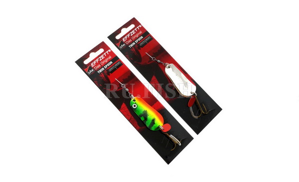 Данная модель колеблющейся блесны (Effzett Twin) представляет собой не что иное, как две облегчённые колебалки такого же размера из серии Effzett Standart (они же Шторлинг), которые между собой соединены заводными кольцами.