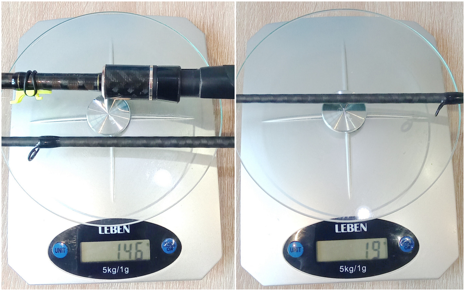 Спиннинг можно сказать лёгкий для такого теста, мои весы показали общий вес 146 грамм, вес вершинки - 19 грамм.