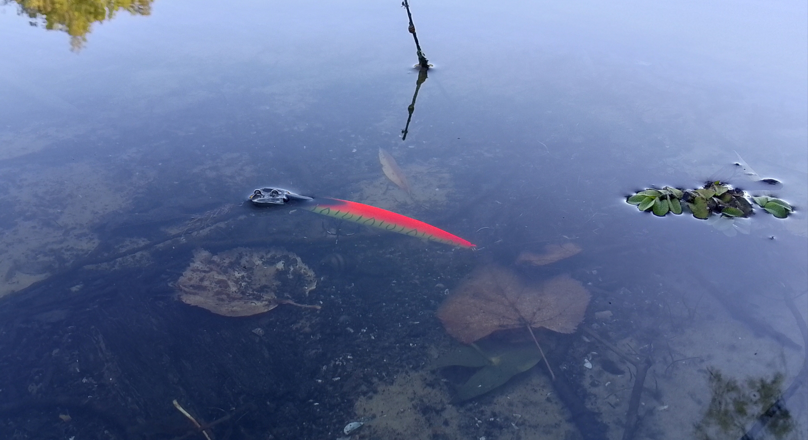 Strike Pro Top Water Minnow типичный представитель воблеров класса минноу с нетипичной, для приманок такого класса, лопаткой. Его отличительной особенностью является наличие двух петелек крепления приманки к поводку, которые последовательно расположены на лопатке. Сама лопатка имеет минимальный угол отклонения от воблера, что не даёт ему возможности в процессе подачи заныривать глубже указанного горизонта. Согласно указанных характеристик, максимальная глубина заныривания Strike Pro Top Water Minnow семьдесят сантиметров и данный показатель достигается путем крепления воблера за вторую петельку, расположенную ближе к голове приманки. В случае монтажа воблера за первую петельку, глубина заныривания будет достигать не более тридцати сантиметров. Таким образом, узконаправленная приманка, в определённых условиях, становится достаточно универсальной и вариативной. В моём случае, я получил полноценного подповерхностного провокатора, который даёт возможность искать хищную рыбу в условиях малых глубин и в тех местах, где дно водоёма полностью покрыто плотной растительностью.