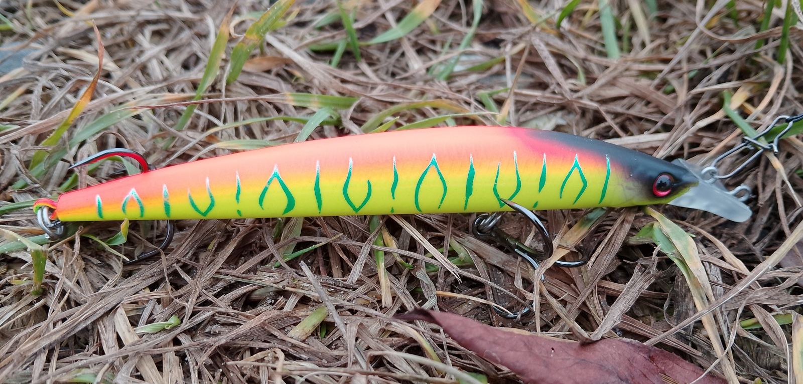 Воблеры Strike Pro Top Water Minnow представлены на рынке в трëх вариантах размеров: 90 миллиметров, весом 10,2 грамма, 110 миллиметров, весом 10,5 грамм и 130 миллиметров, весом 16 грамм. Все три варианта плавающие. Я для себя выбрал воблер в размере 110 миллиметров, золотую середину, из расчета, что помимо пирующей щуки буду пробовать ловить местного судачка, который чаще всего попадается не крупный, до киллограмма весом и на стотридцатые воблеры практически не реагирует. Из тех же соображений, я не стал приобретать воблер в девяностом размере, чтобы была возможность хоть немного отсечь окуня, которого в наших водоёмах предостаточно и ловлю я его немного другими снастями, на другие приманки.