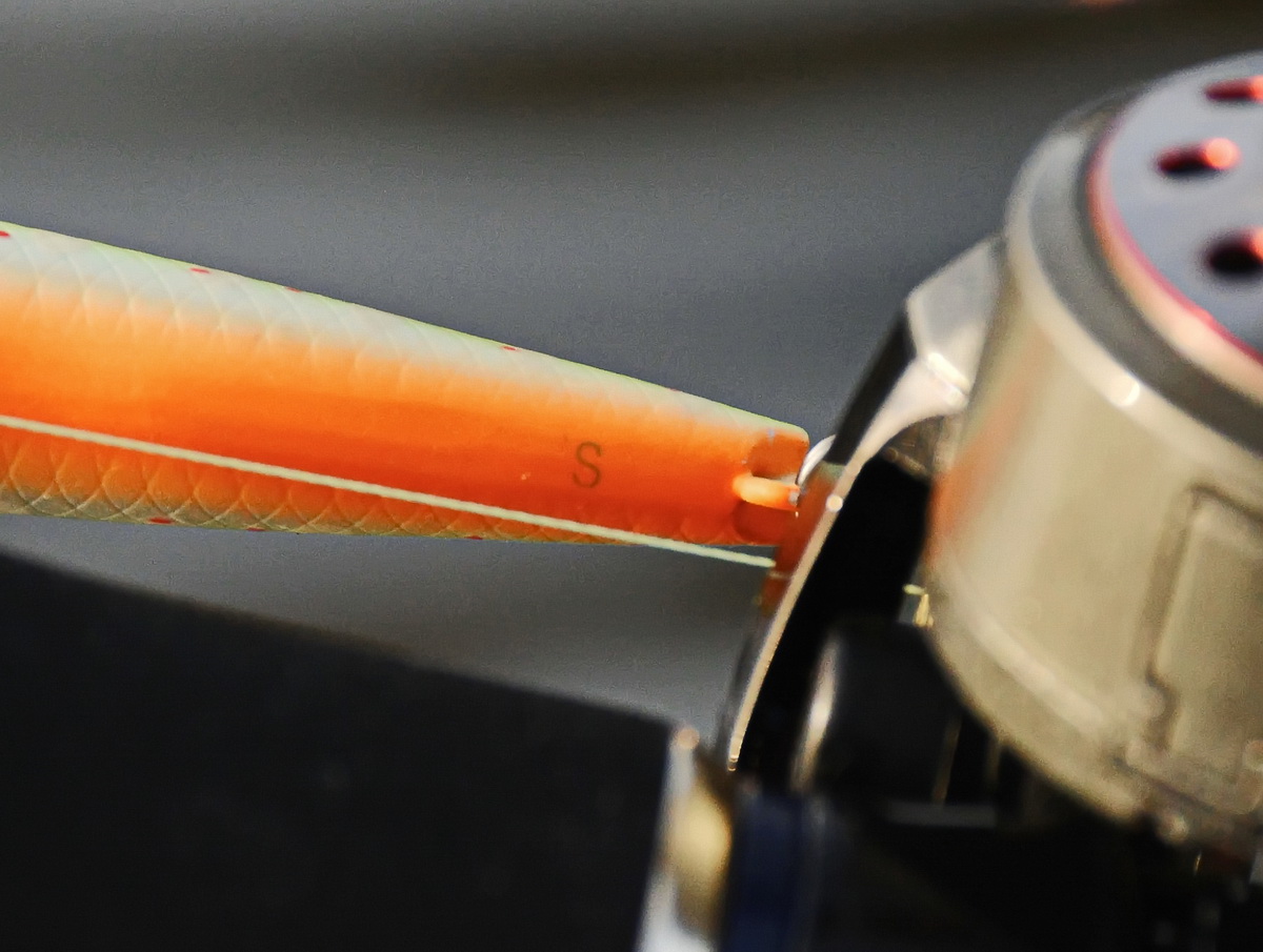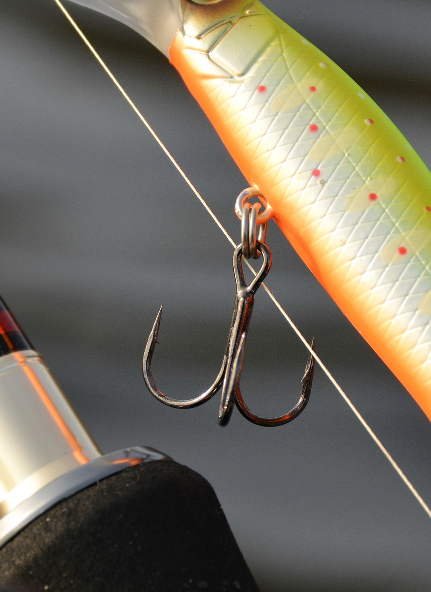 Оснащён IB Minnow Jet 95 крупными и мощными, сделанными из толстой проволоки заводными кольцами. Правда, с традиционным для фирмы Strike Pro недостатком – не плотно прилегающими друг к другу витками. И острейшими тройными крючками № 4 из серии OH ST-46. Они (крючки) внешне и по маркировке напоминают продукцию фирмы Owner.