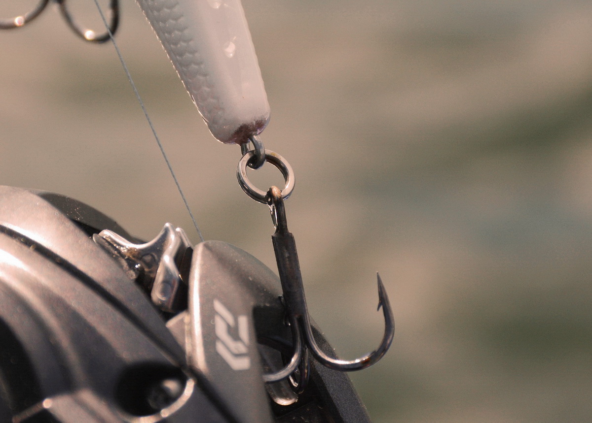 Оснащён этот воблер мощными шестёрками неизвестного происхождения и не менее мощными заводными кольцами большого размера, одно из которых, расположенное на заглубляющей лопасти имеет овальную форму, прямо как на воблерах компании Лакки Крафт.