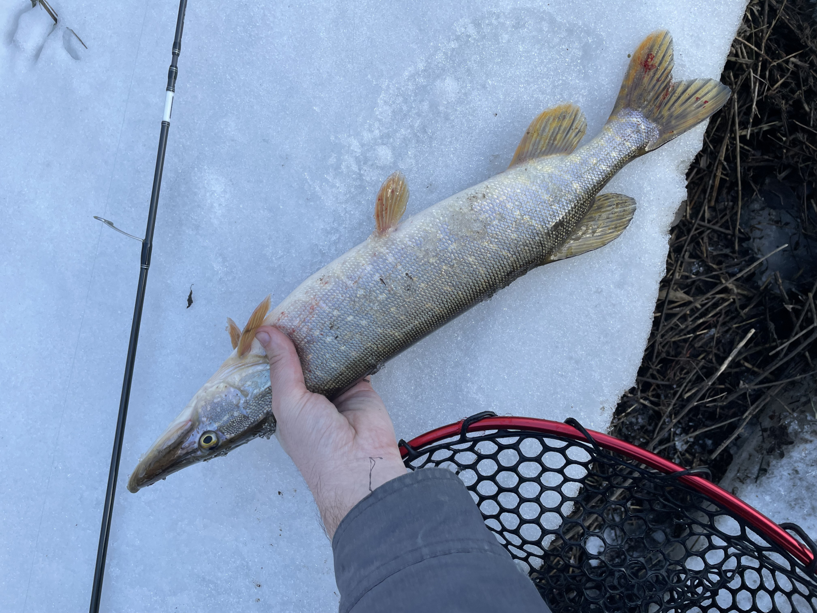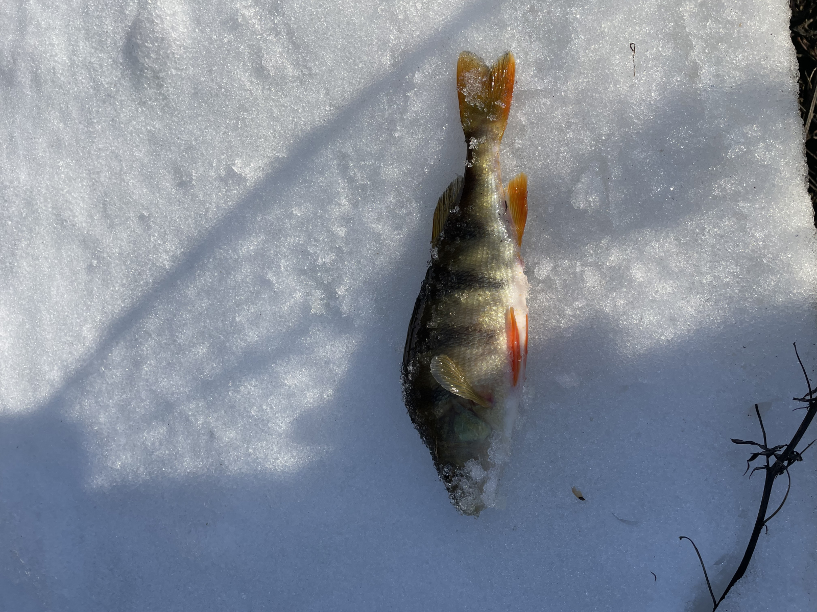 Первый же заброс вдоль заснеженного берега принёс поклёвку. На том конце лески отчаянно сопротивлялся окунь — первый трофей сезона!