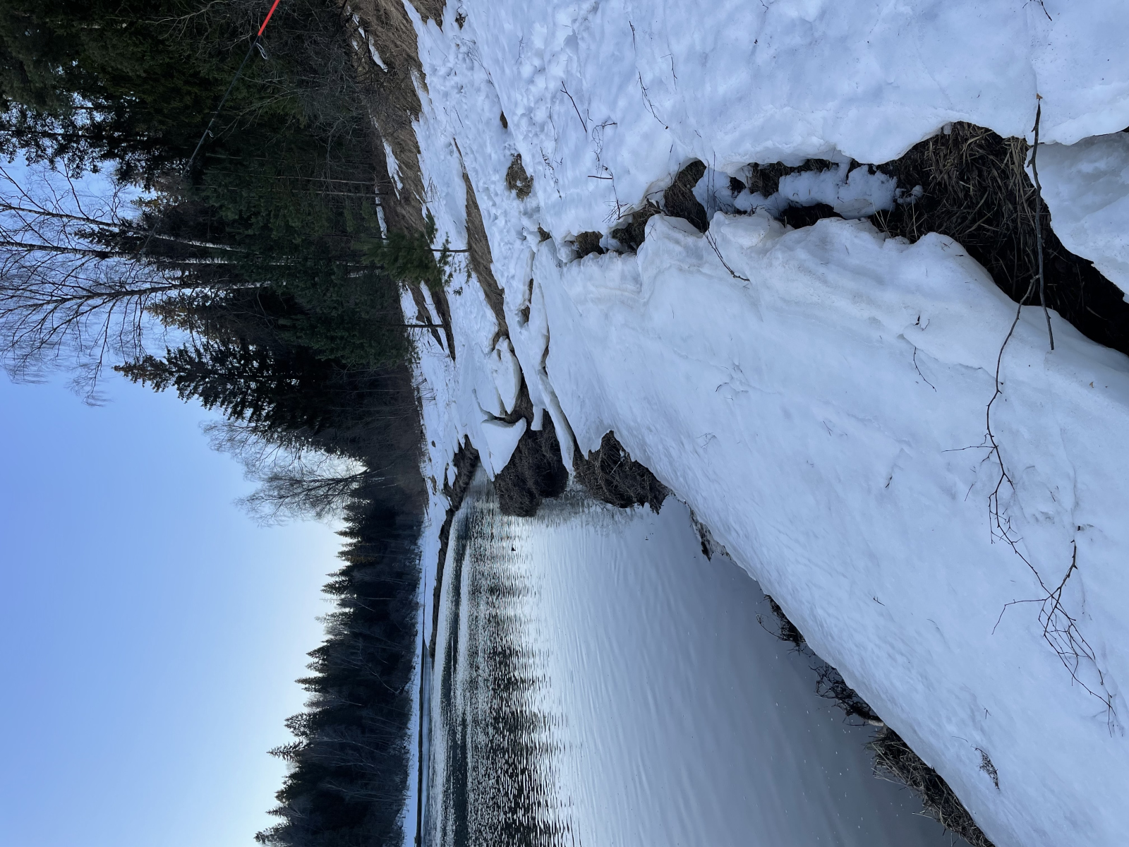 Какую же реку я выбрал? Река среднего размера, хорошо известная мне, где на летней рыбалке ловил и окуня, и щуку, и жереха, и головля. Добравшись до реки, передо мной открылась следующая картина: берега реки ещё были укрыты снегом, а уровень воды стоял достаточно низкий, что характерно для ранней весны.