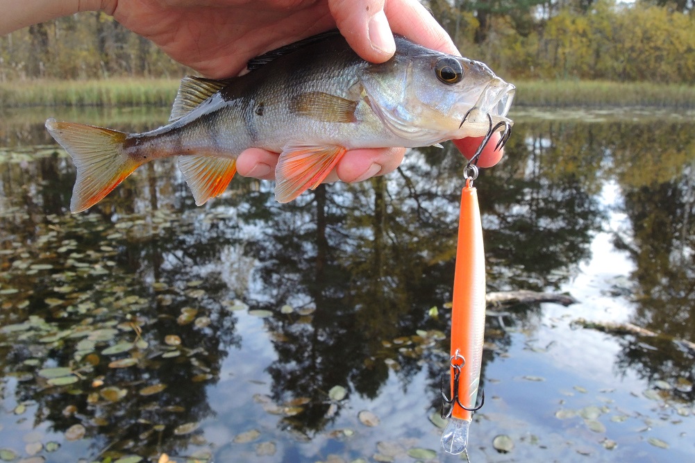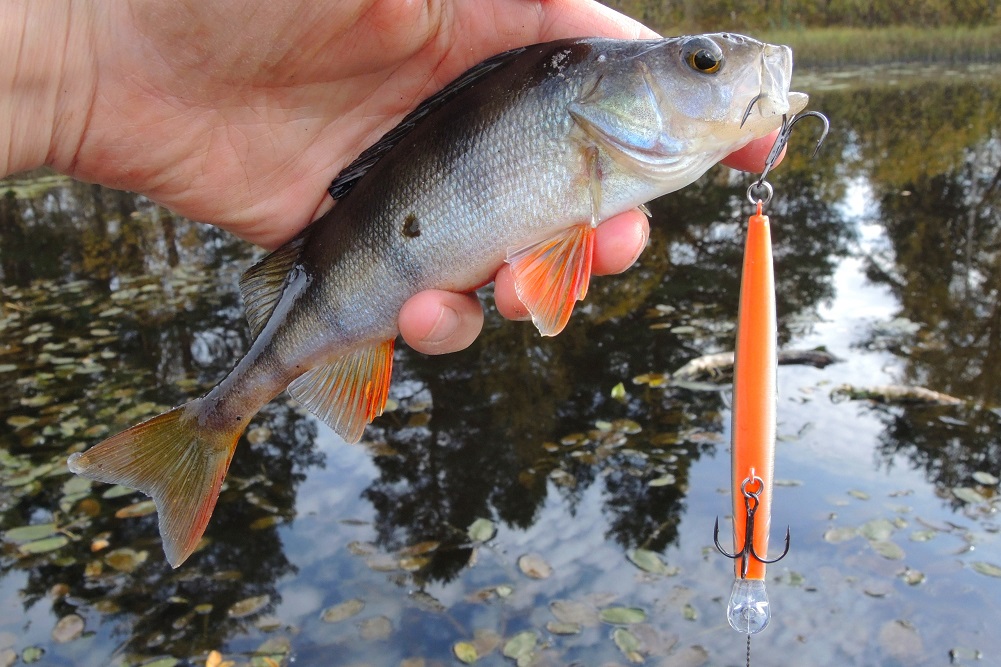 Буквально в октябре этого года я выбрался на одно пойменное озеро. Чаще всего, а в это время особенно, попадается щука. Проплыв в дальний конец, я начал облавливать слабозаросшую гладь среди остравков водной растительности. После первой поклевки я ощутил, что на крючке кто-то некрупный. Но все же я думал, что это щуренок. Однако на это оказался именно окунь. А клюнул он жадно.