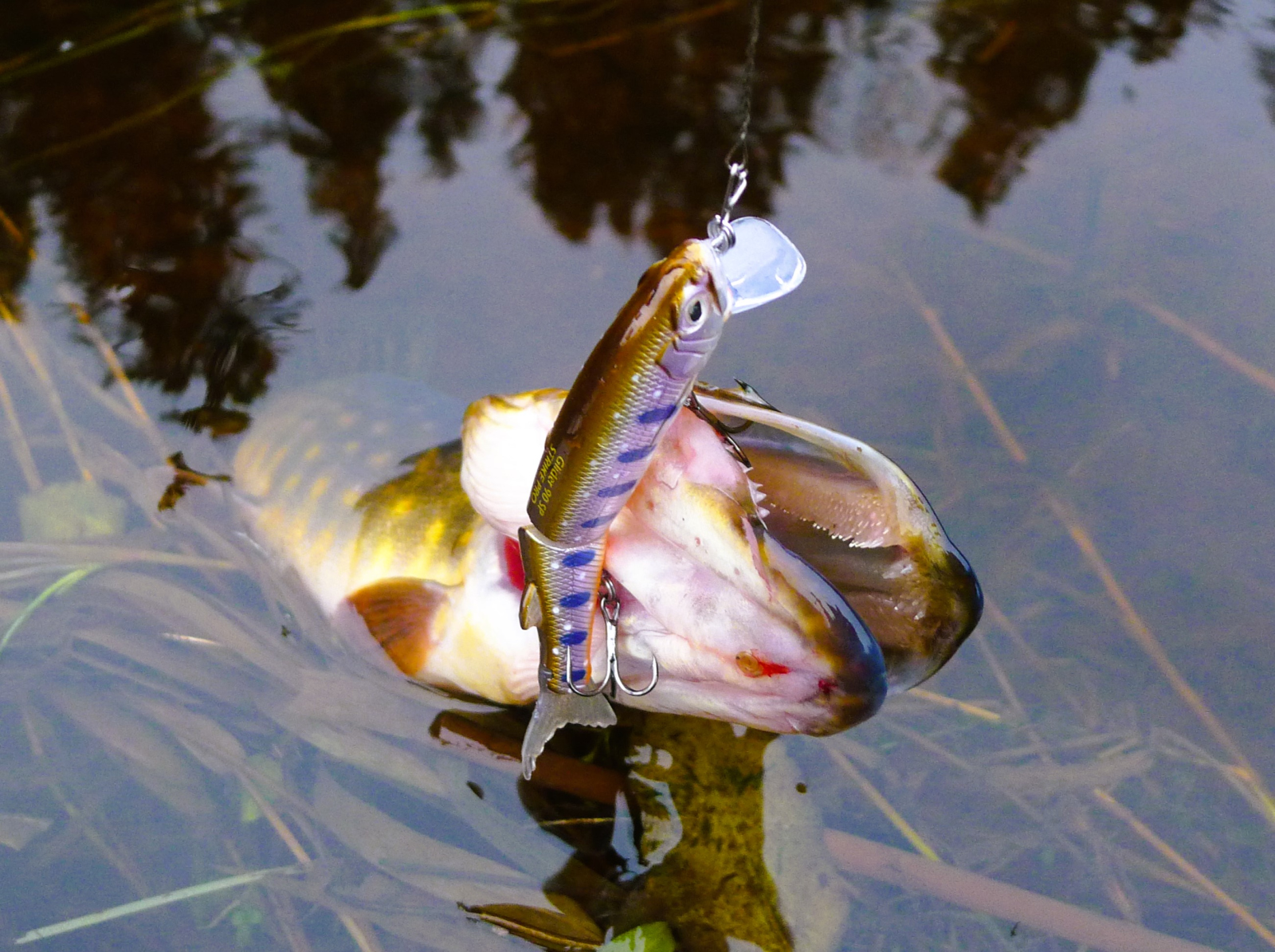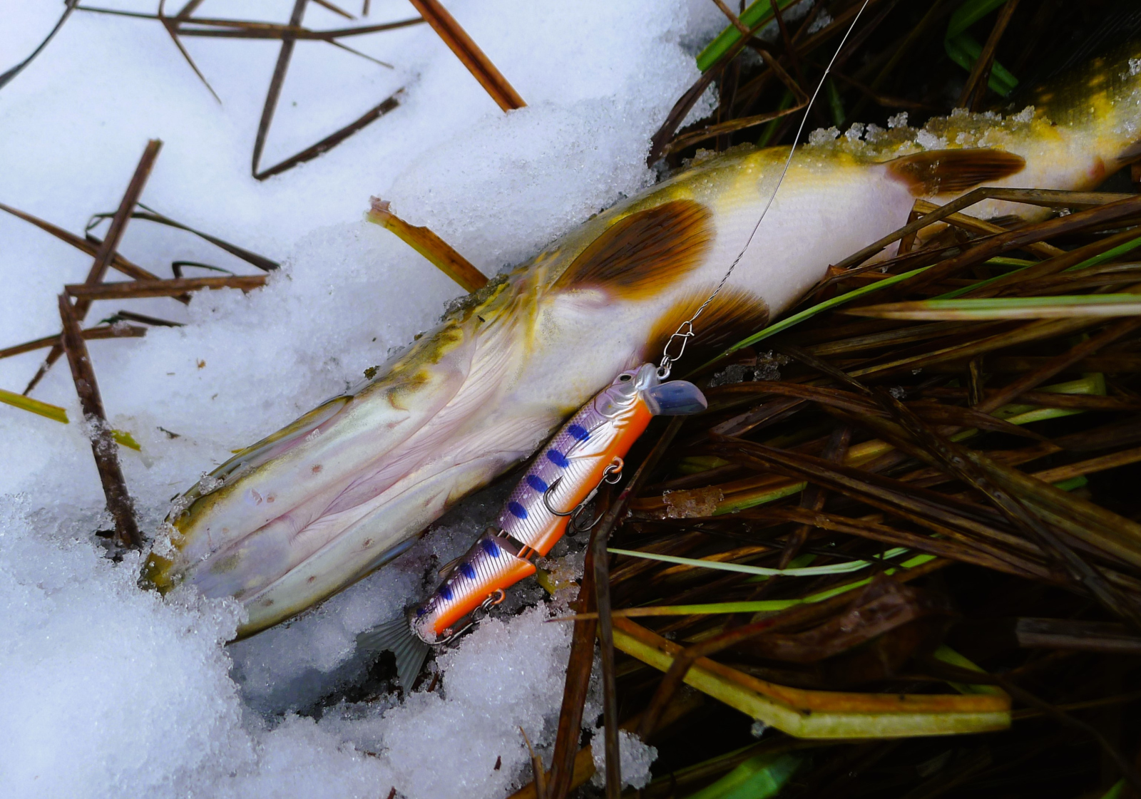 В проводке Глайдера ничего нового, в сравнении с теми же магалоноподобными составниками, нет. Это равномерные проводки и потяжки, стоп/гоу и рывковая анимация без фанатизма. Легкие рывочки с паузами, порой длительными, на мой взгляд, самый интересный способ ловли на Glider 90SP. Можно даже на месте играть им какое то время, проверяя на прочность упрямство щуки на очевидной точке. Воблер мне показался чуть-чуть более упористым, в сравнении с «Тини Магалоном», а еще он более стабильно набирает глубину и держится на ней, в пределах 90-110см.