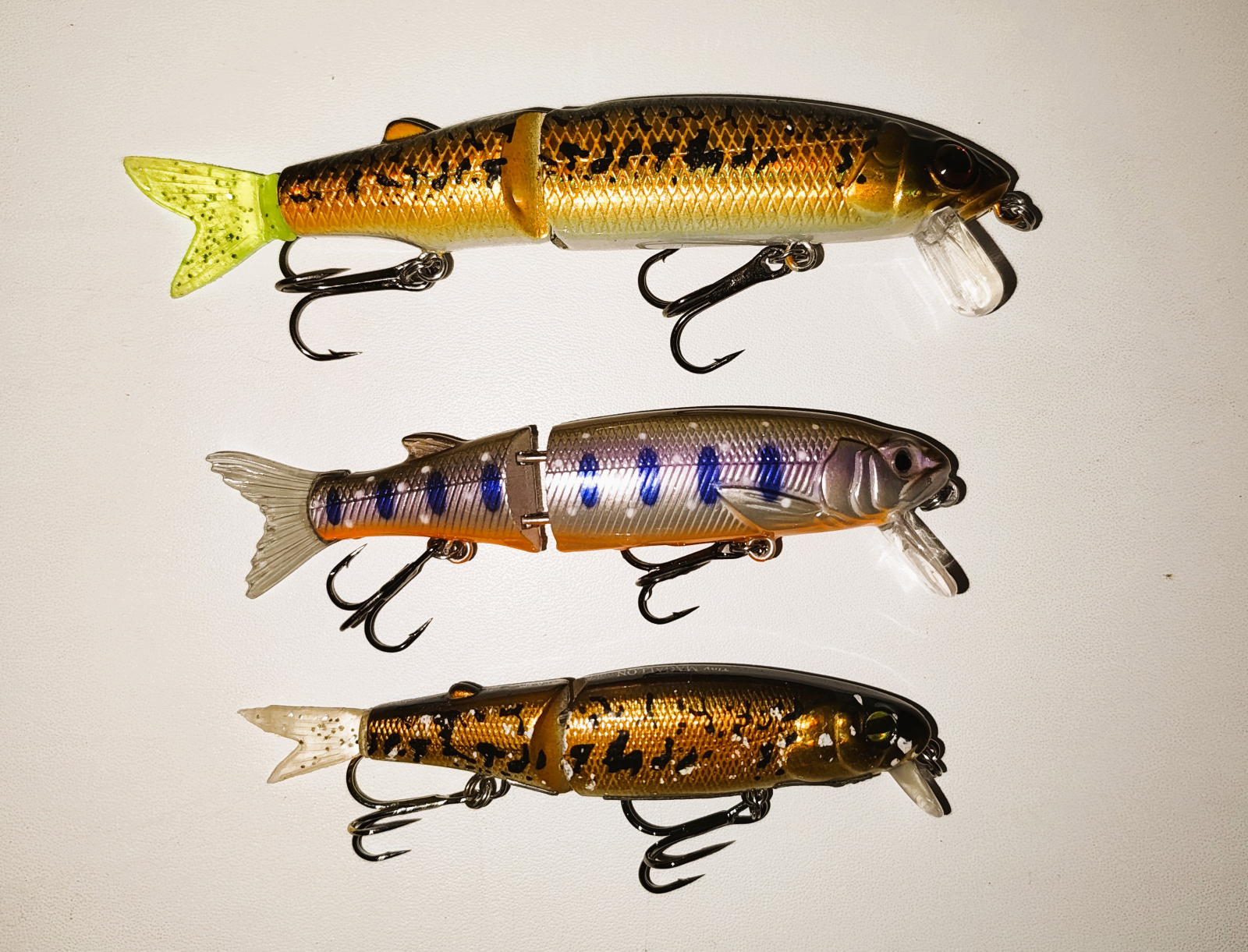 Среди различных свимбейтов, то бишь воблеров-составников, на сегодняшний день более всего клонов посвящено джекаловскому хиту «Магалон» и еще больше его младшему брату. Но вот купив как-то нечто похожее от компании Strike Pro, я несколько удивился, поскольку их воблер-составник Glider 90SP, оказался на поверку вовсе не тем, кем показался. При внимательном рассмотрении, Strike Pro Glider 90SP, выяснилось, что если за его основу и взят был какой-либо образец японского свимбейта, то либо это был не «Магалон», либо в Strike Pro его модифицировали до неузнаваемости, на фото ниже он между старшим и младшим Магалонами и разница заметна сразу. В этом воблере скорее есть нечто от свимбейтов Gan Craft, хотя и от них отличий более чем достаточно, дабы признать эту приманку вполне оригинальной разработкой Strike Pro.