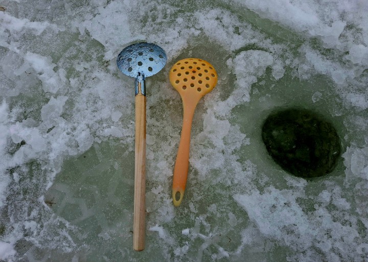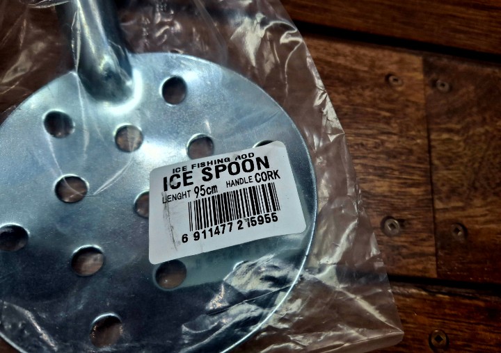 Третье, плохие плавательные способности. Нет здесь ничего, что спасло бы черпак от судьбы стать утопленником- ни хорошо вспененной рукояти, ни какого-либо иного поплавка. Вообще металлические черпаки никогда не видел плавающими, поэтому приходится самому так или иначе решать названную проблему. Пластиковые черпаки плавают, но ещё задолго купаний в лунке они ломаются. Из двух зол приходится выбирать что-то одно.