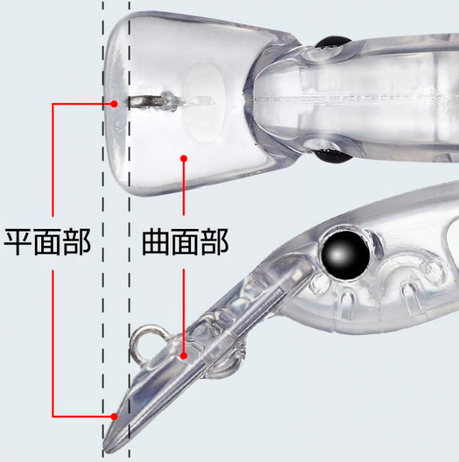■ Корпус Утолщенный корпус обеспечивает плавучесть. Чтобы устранить свойственный извивающимся приманкам недостаток – нестабильность полета и игры из-за дугообразной формы – поверхность сделана простой и гладкой, без выступов и впадин. Это упорядочивает потоки воздуха и воды, повышая стабильность полета и игры.
