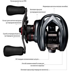 Корпус выполнен из алюминиевого сплава методом литья и холодной ковки. Конструкция цельная без соединений между рамой и пластинами. Установлено 6+1 герметичных шарикоподшипников с двойным уплотнением. Рукоятка изготовлена из карбона.