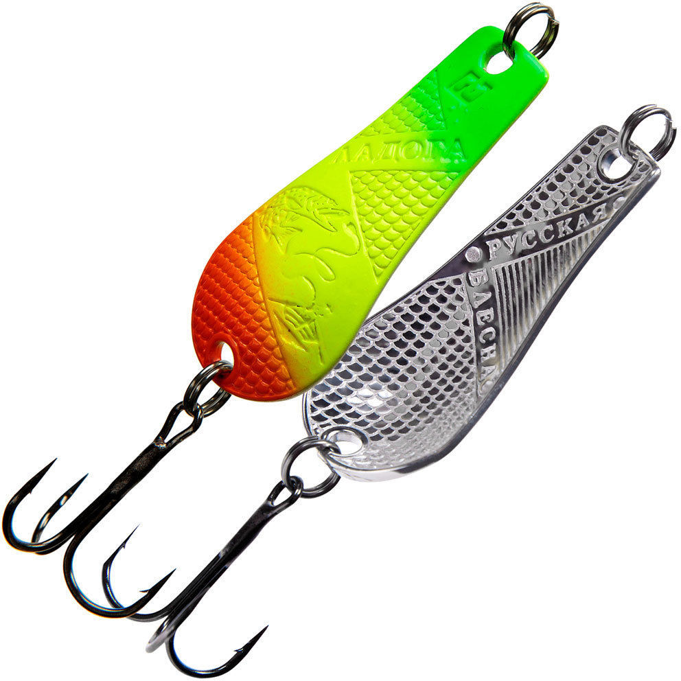 Вариации веса блесен Ладога: 12 и 17 гр, где легкие приманки используются, как правило при береговой ловле в водоемах без течения, а тяжелые применяются при ловле с лодки на глубинах или течении.