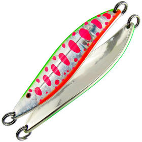 *Дизайн под форель и ленка. Издавна замечено что лососи идя на нерест не питаются, но проявляют агрессию к другим мелким рыбам. Основным раздражителем в реке выступают мелкие лососевые рыбы, как правило это молодь форели или ленка. Создавая раскраску блесны, чем-то похожую на нее, мы имитируем это сходство, поэтому рыболовы и придерживаются теории, что эта одна из эффективных раскрасок блесен.